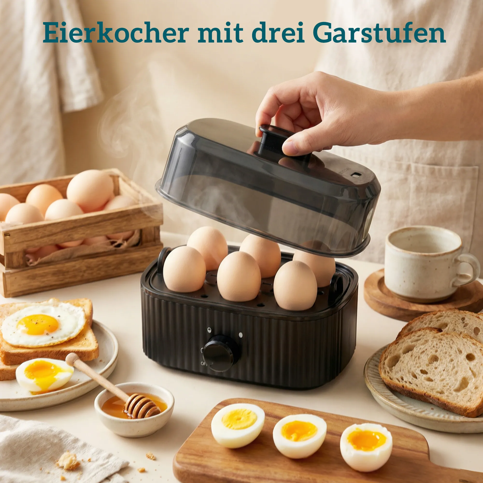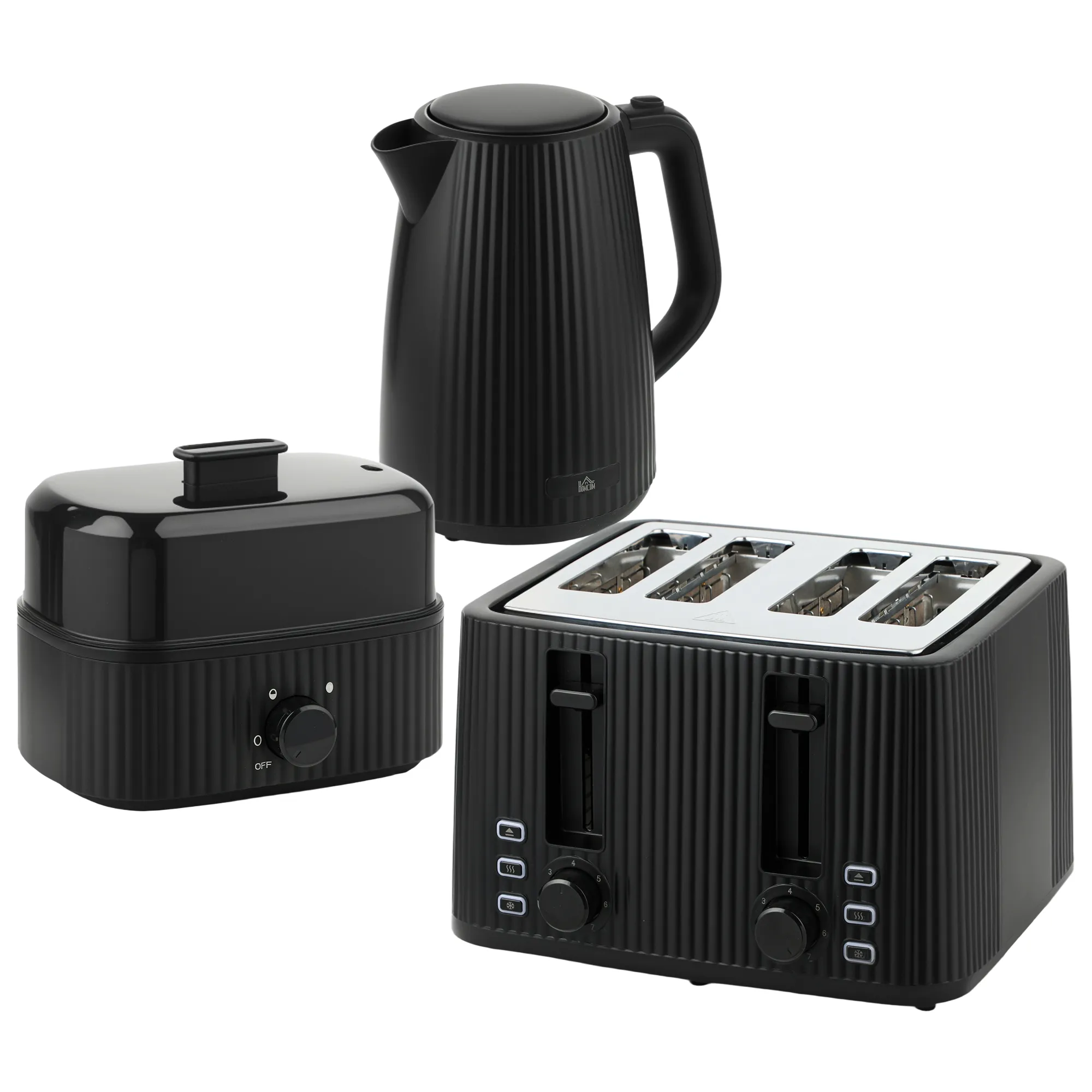• Compleet ontbijt: waterkoker, broodrooster en eierkoker in één set