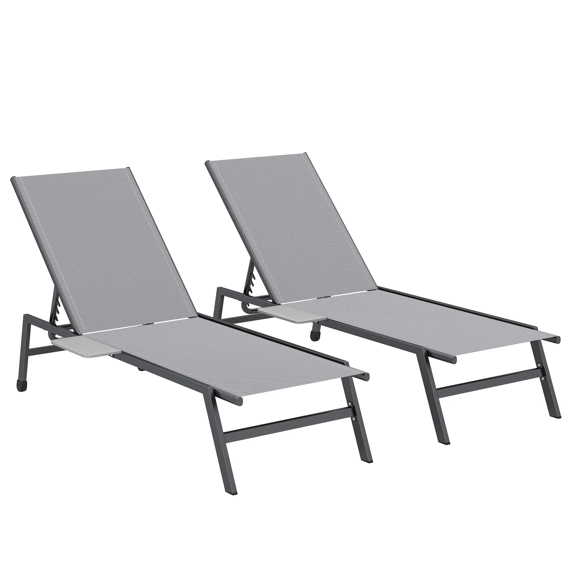 2-delige Set Tuinligstoel Met 5-voudig Verstelbare Rugleuning, Zijtafel, 2 Wielen, Antislip Voeten Grijs