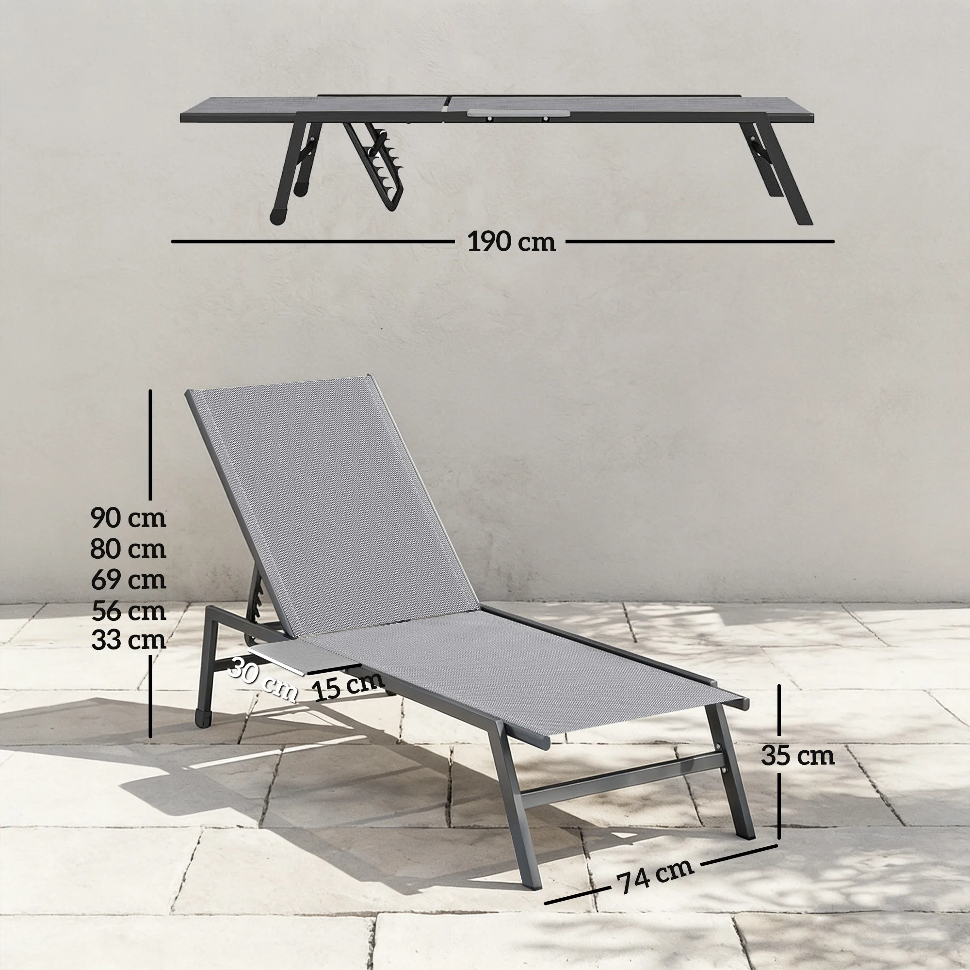 • Afmetingen ligstoel: 190 x 74 x 35 cm (LxBxH)