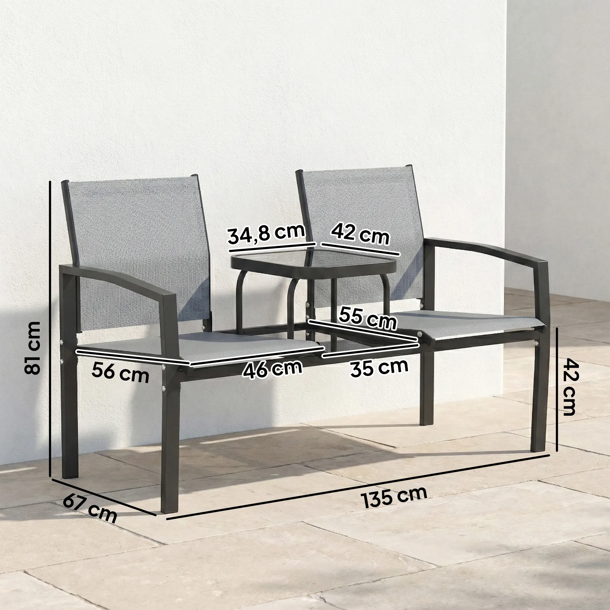 2-zits Tuinbank Met Rug- & Armleuningen, 2-traps Glazen Tafel Parkbank 240kg Belastbaar 135 X 67 X 81 Cm Grijs