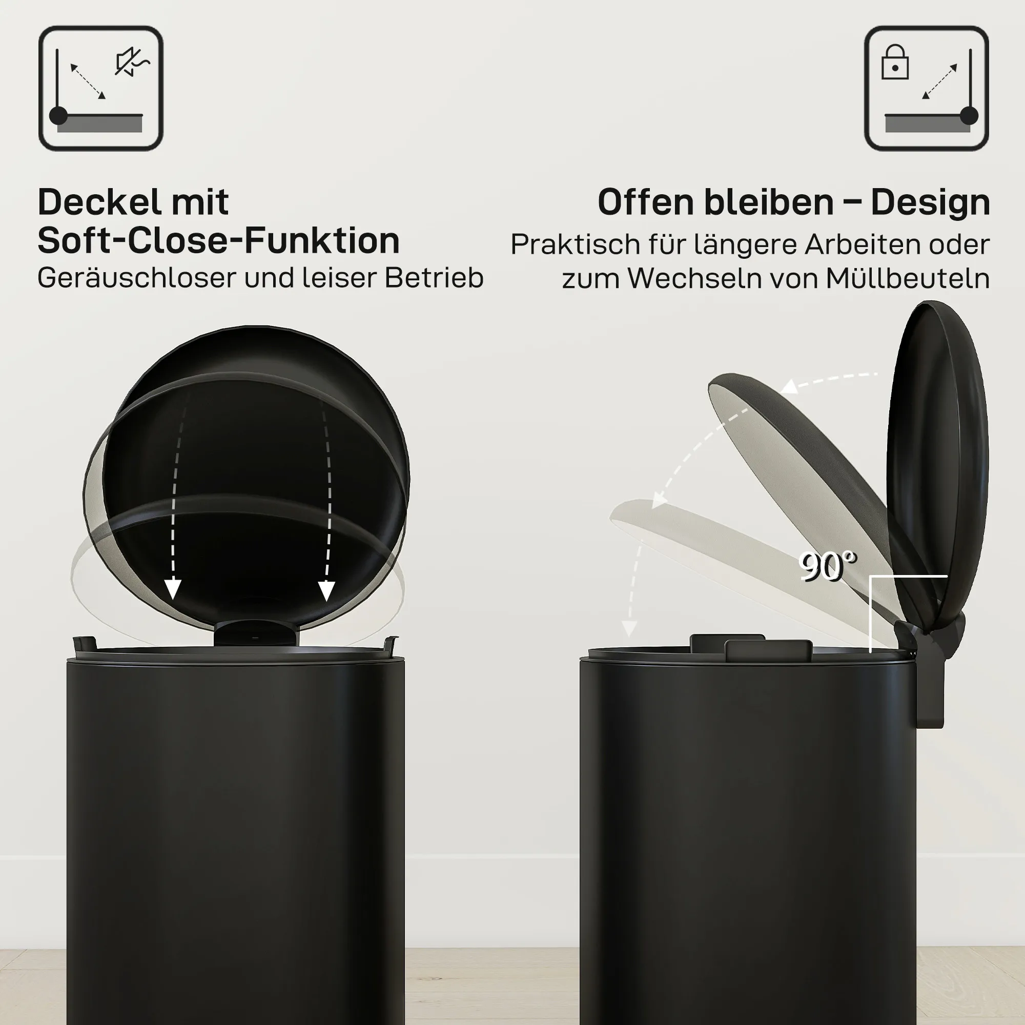 - Gebruiksgemak: soft-close- en stop-open-deksel, praktisch pedaal voor handsfree bediening