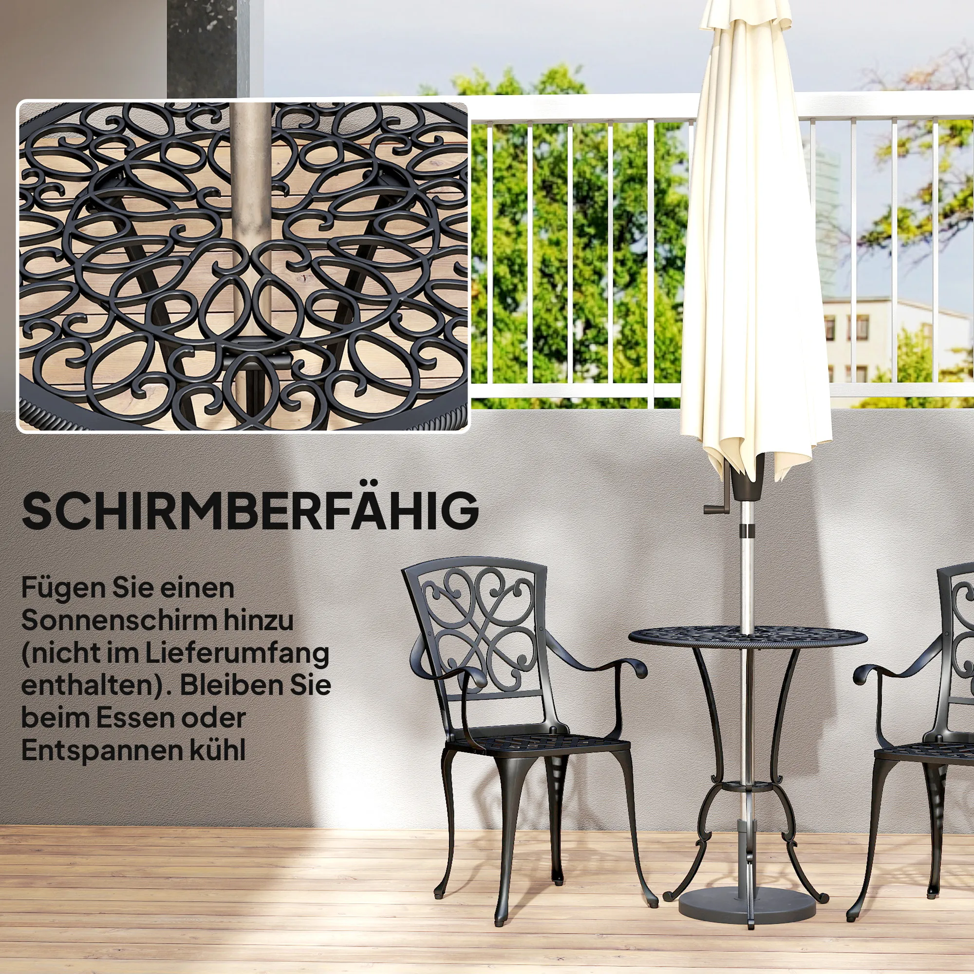 Wil je nieuw leven in je balkon blazen? Het is vervelend als wiebelende meubels gaan roesten en de felle zon je ontspanning buiten verstoort. Deze [BRAND NAME] balkonmeubelset biedt de oplossing. Gemaakt van weerbestendig gegoten aluminium met elegante details, biedt deze 3-delige bistroset een duurzame toevluchtsoord. Het centrale parasolgat van de tafel zorgt ervoor dat je talloze zonnige middagen comfortabel kunt genieten van je buitenbistroset.