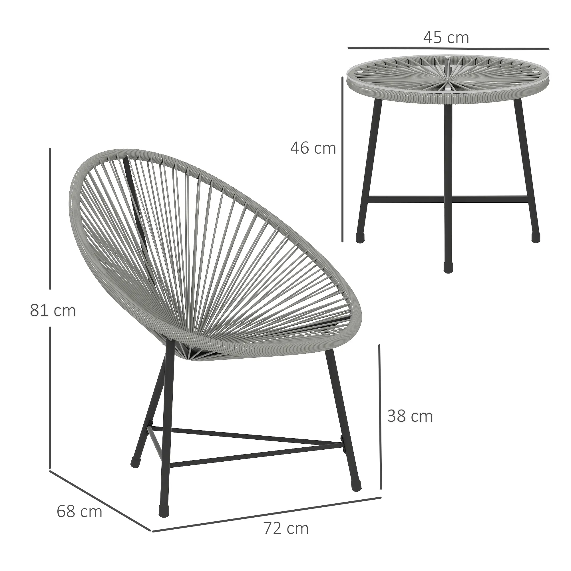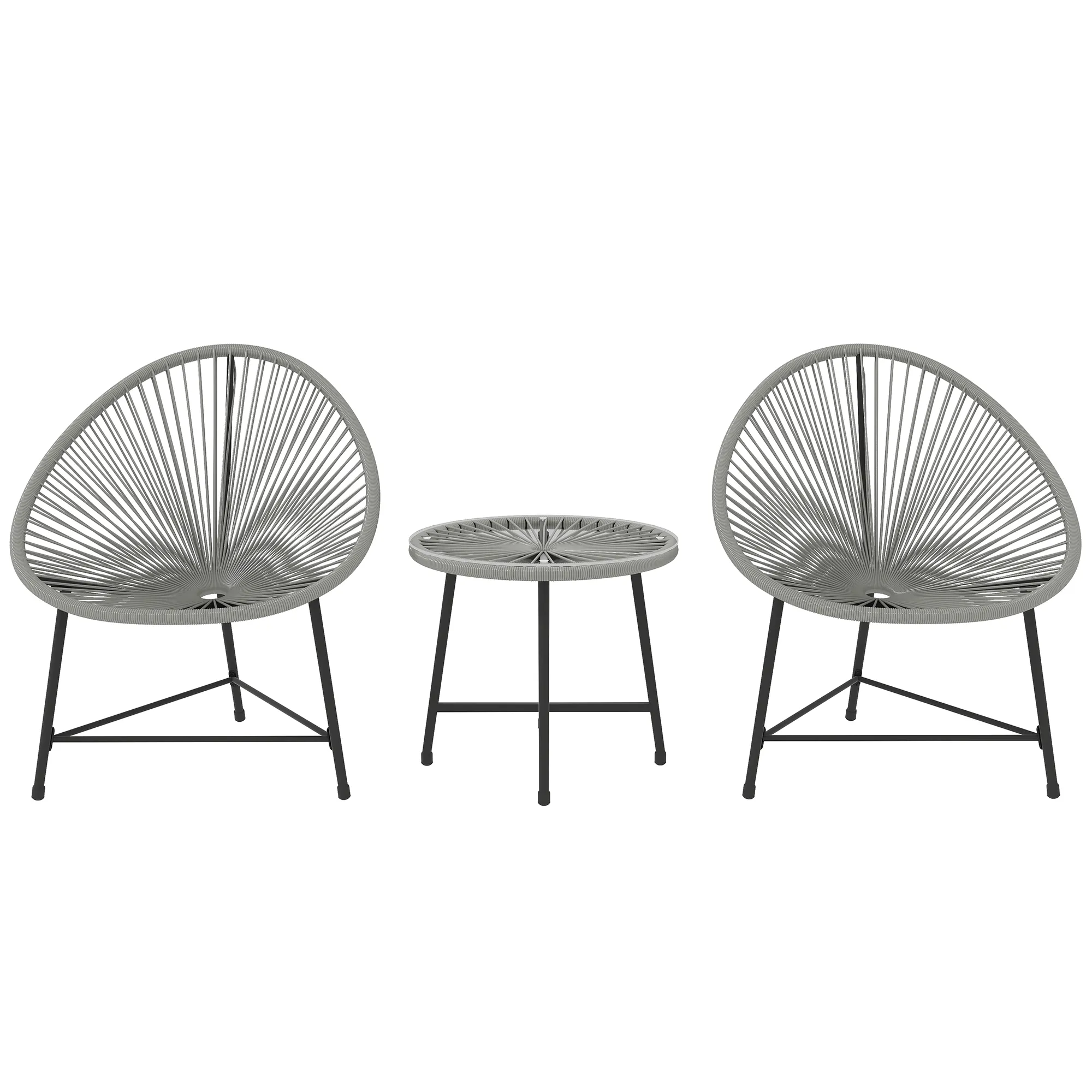 Ontspan in stijl op je balkon met de elegante [BRAND NAME] balkonmeubelset. Deze set bestaat uit twee ovale Acapulco-stijl stoelen en een bijpassende salontafel. De flexibele kunststof rotan touwen en het hol geweven ontwerp van de bistroset zorgen voor een koele en comfortabele zitplaats. De salontafel met gehard glas is chic en makkelijk schoon te maken. De stalen frames en verstelbare voetkussens bieden stabiliteit en ondersteuning. Geniet van het comfort en de stijl van deze balkonmeubelset.
