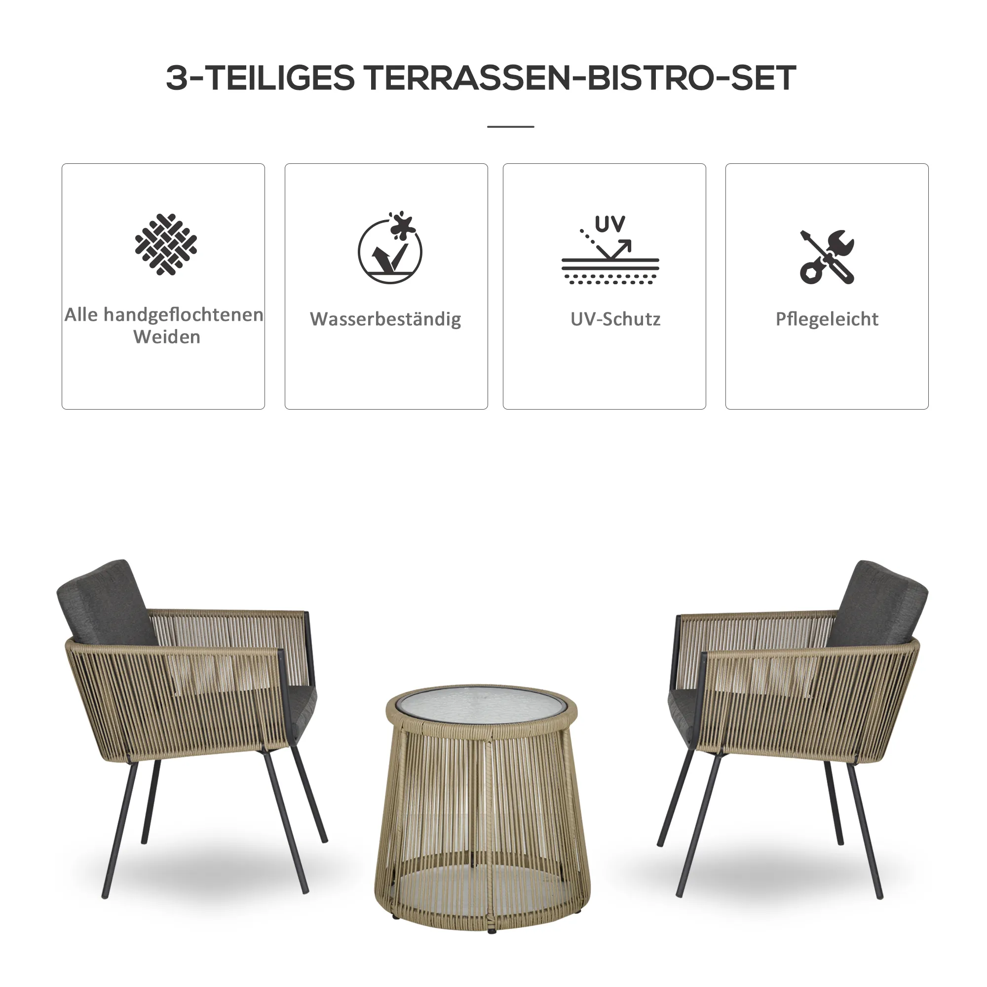 3-delige Zitgroep, 2 Stoelen, Bijzettafel, Zit- & Rugkussens, Hardglas Tafelblad, Kunstrattan, Grijs