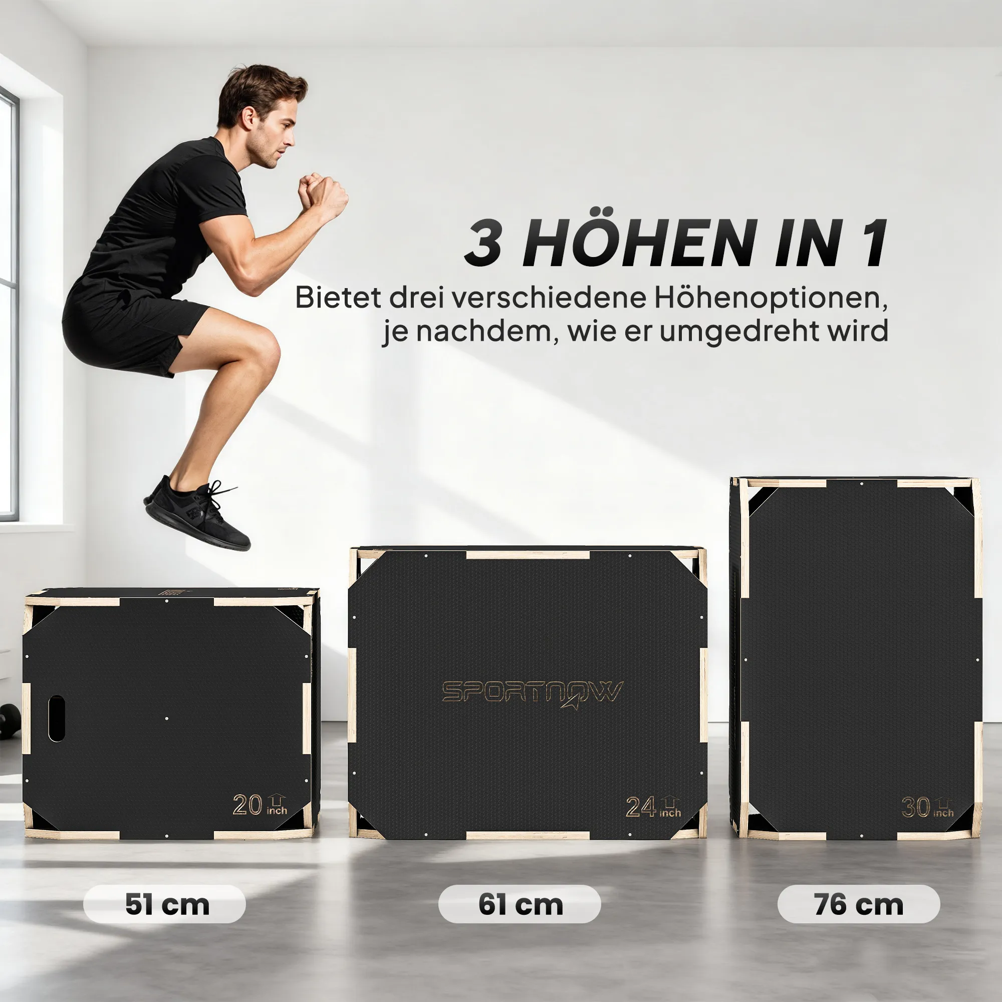 • 3-in-1 ontwerp: drie verschillende hoogtes (76/61/51 cm) voor diverse oefeningen