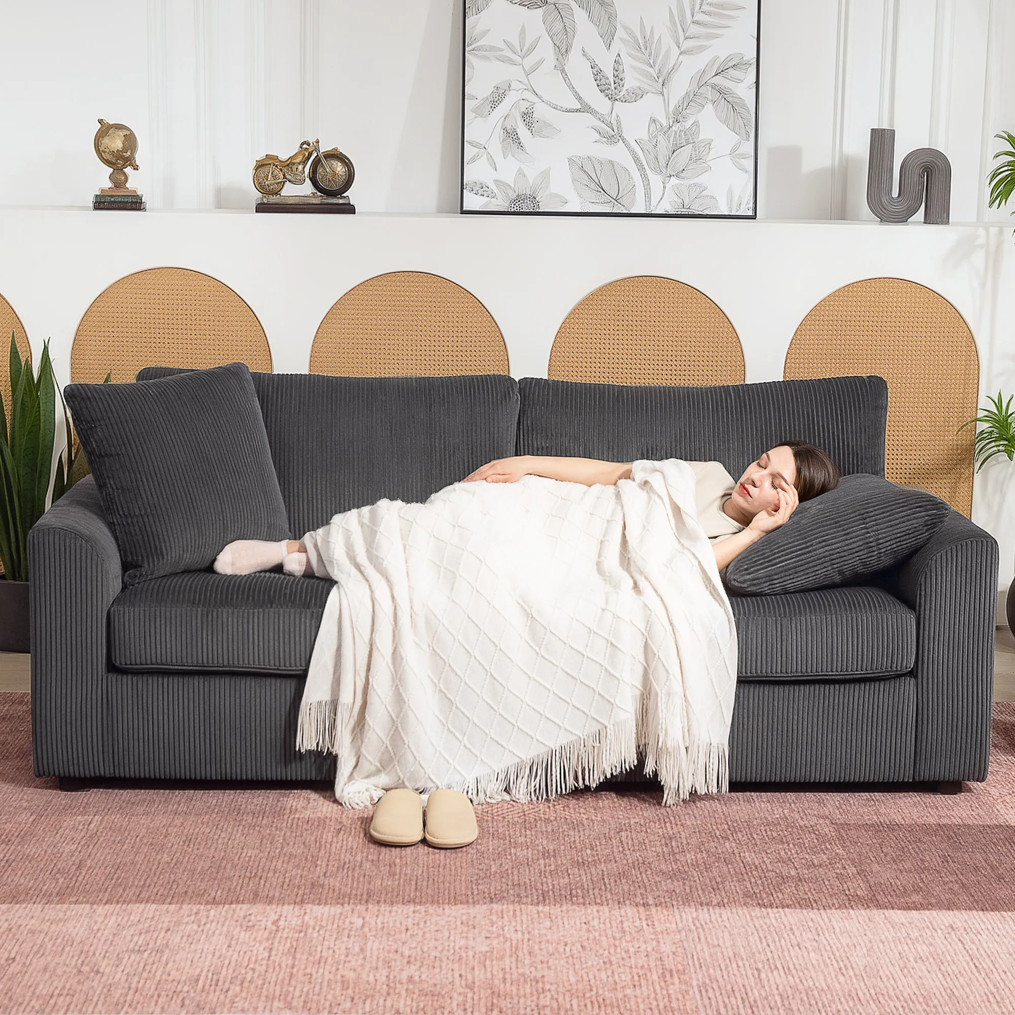 3-zits Bank Met Sierkussens, Corduroy Sofa Voor Woonkamer, Slaapkamer, 212 Cm Breed, Donkergrijs