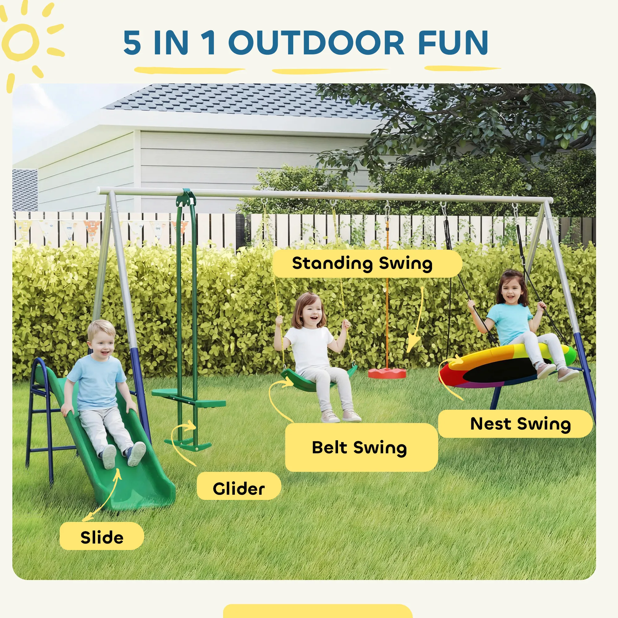 Heb je altijd al van je tuin een magische speelplek voor je kinderen willen maken? Met de [BRAND NAME] 5-in-1 Buitenspeeltorenset wordt dat werkelijkheid! Deze set bevat een glijbaan, een nestschommel, een riemschommel, een glijder en een staande schommel met verstelbare zitjes die meegroeien met je kinderen van 3 tot 8 jaar. Gemaakt van gepoedercoat staal met een versterkt A-frame, is deze set stabiel, veilig en duurzaam. Zo creëer je onvergetelijke avonturen en herinneringen voor het hele gezin in je eigen tuin.
