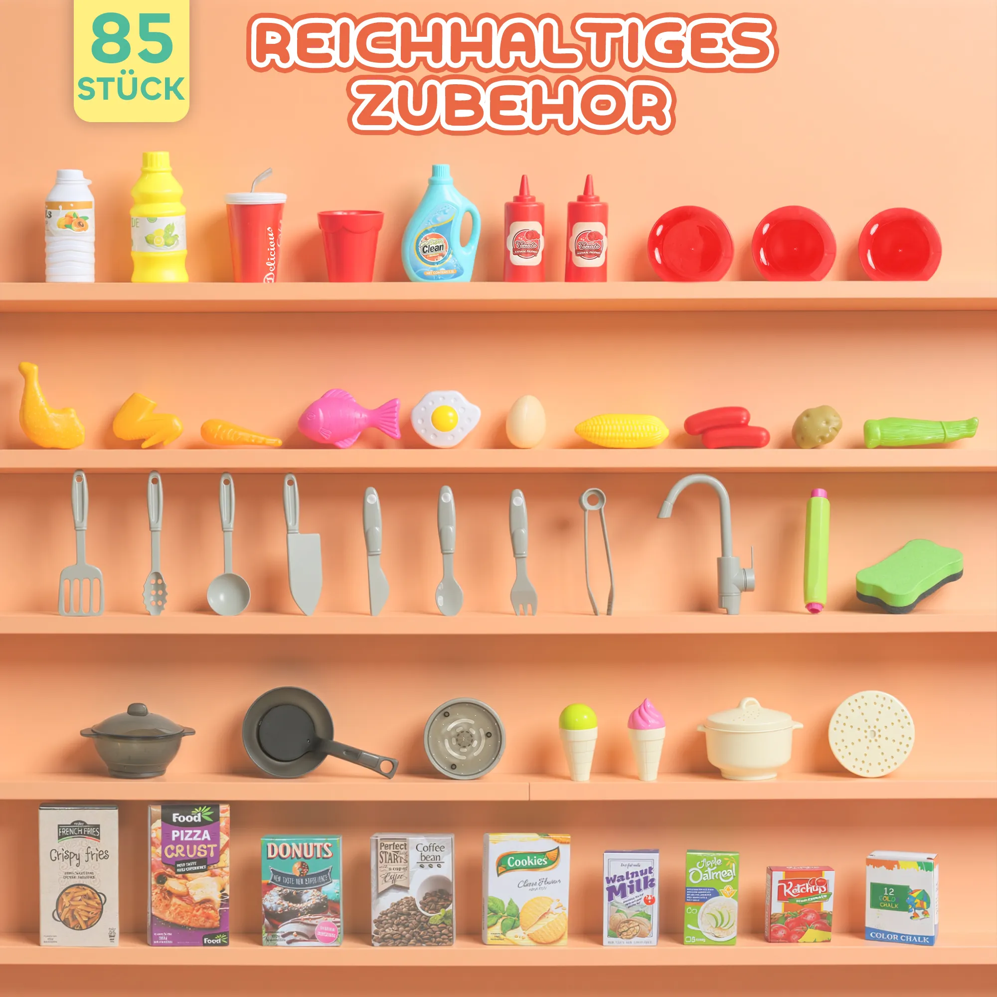 • Realistische functies: Fornuis met mist en kookgeluiden, automatische kraan, interactieve afzuigkap met muziek en licht