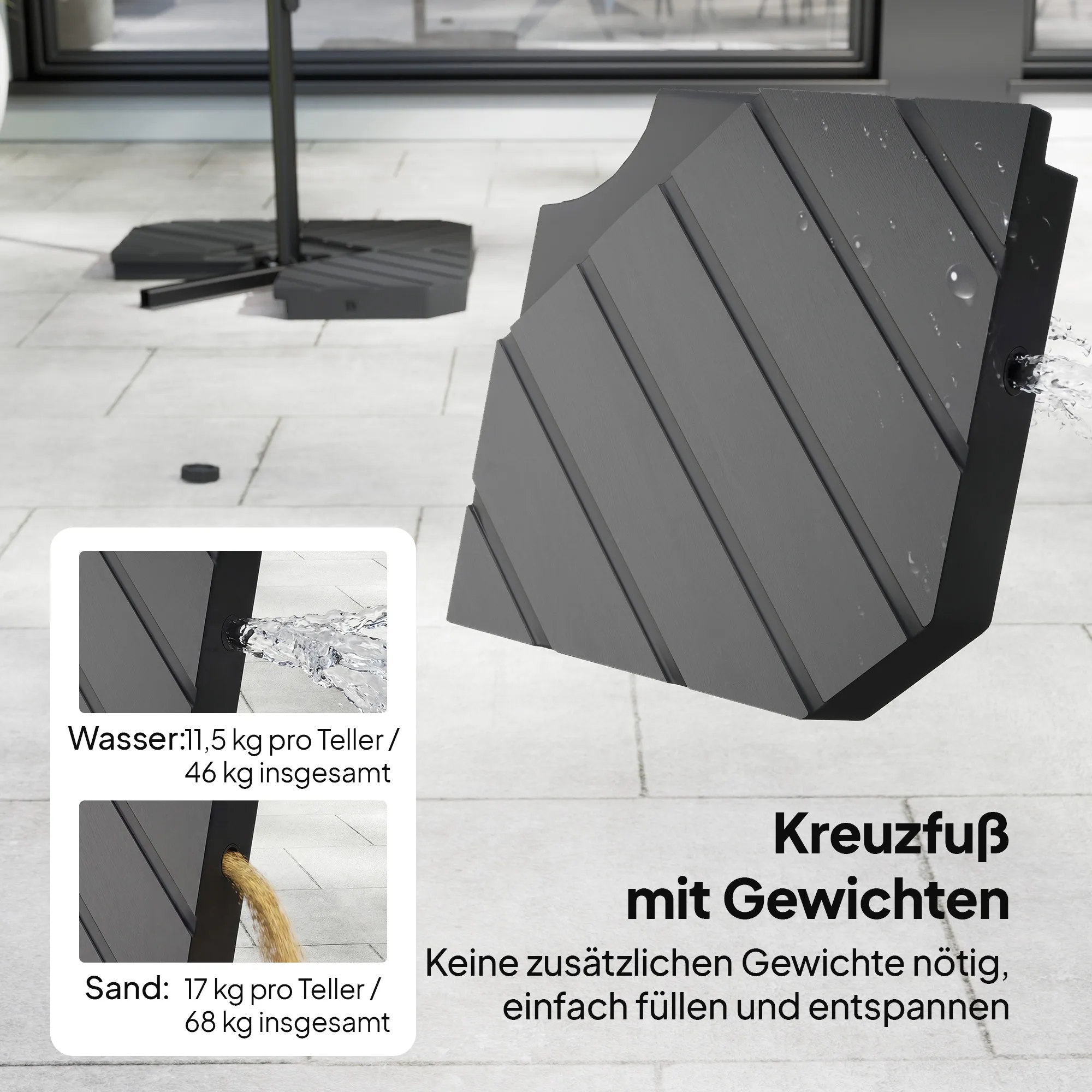 - Gewicht na vulling: 46 kg (water), 68 kg (zand)