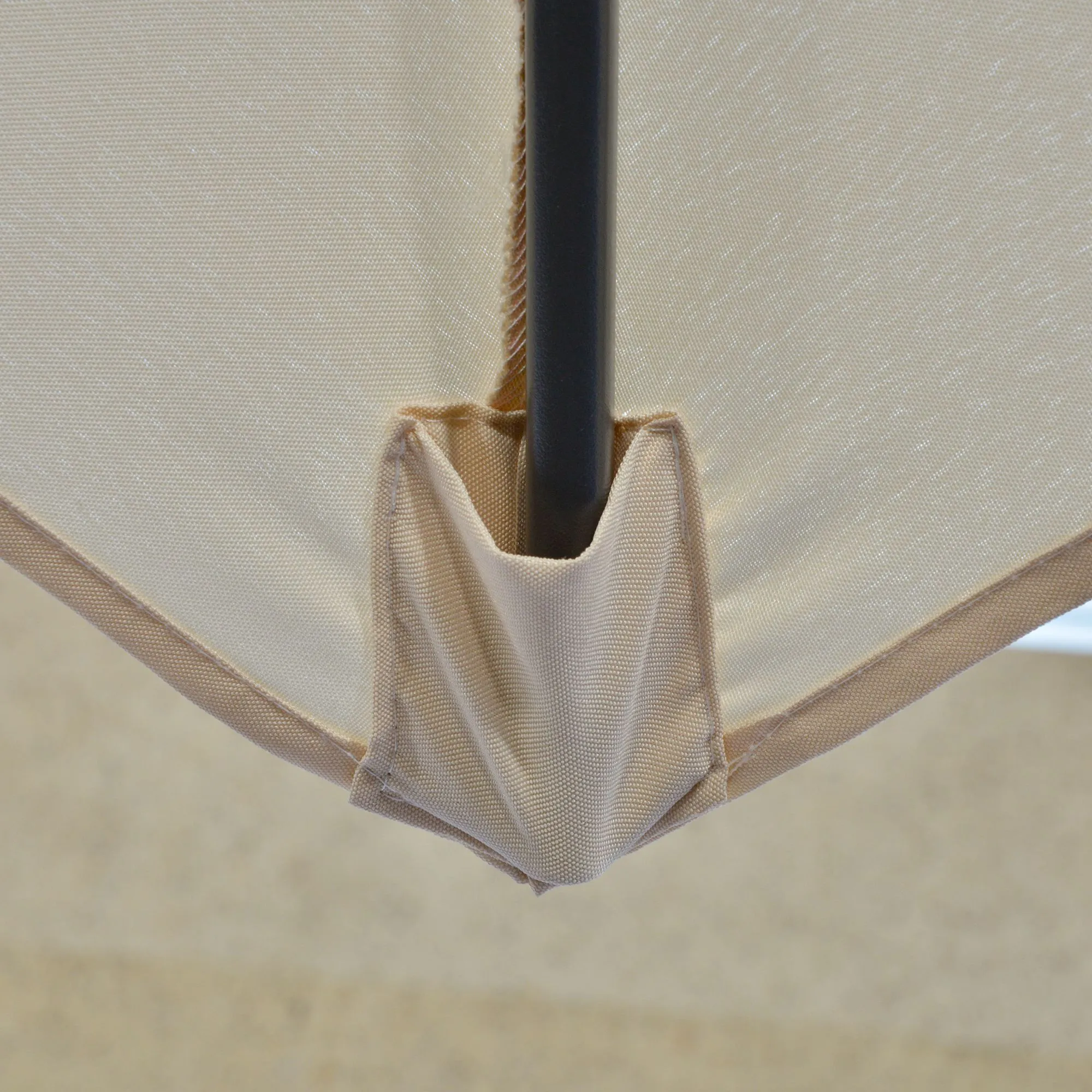 Geniet van schaduw op zonnige dagen met deze grote parasol met standaard van [BRAND NAME]. De stevige metalen mast zorgt voor een stabiele grip, terwijl de polyester hoes voor verkoelende schaduw zorgt. Dankzij de handgreep is de zwevende parasol gemakkelijk te openen en sluiten, zodat je snel van de schaduw kunt genieten. De kruisbasis is inbegrepen, maar gewichten zijn niet inbegrepen (minimaal 60 kg gewicht vereist).