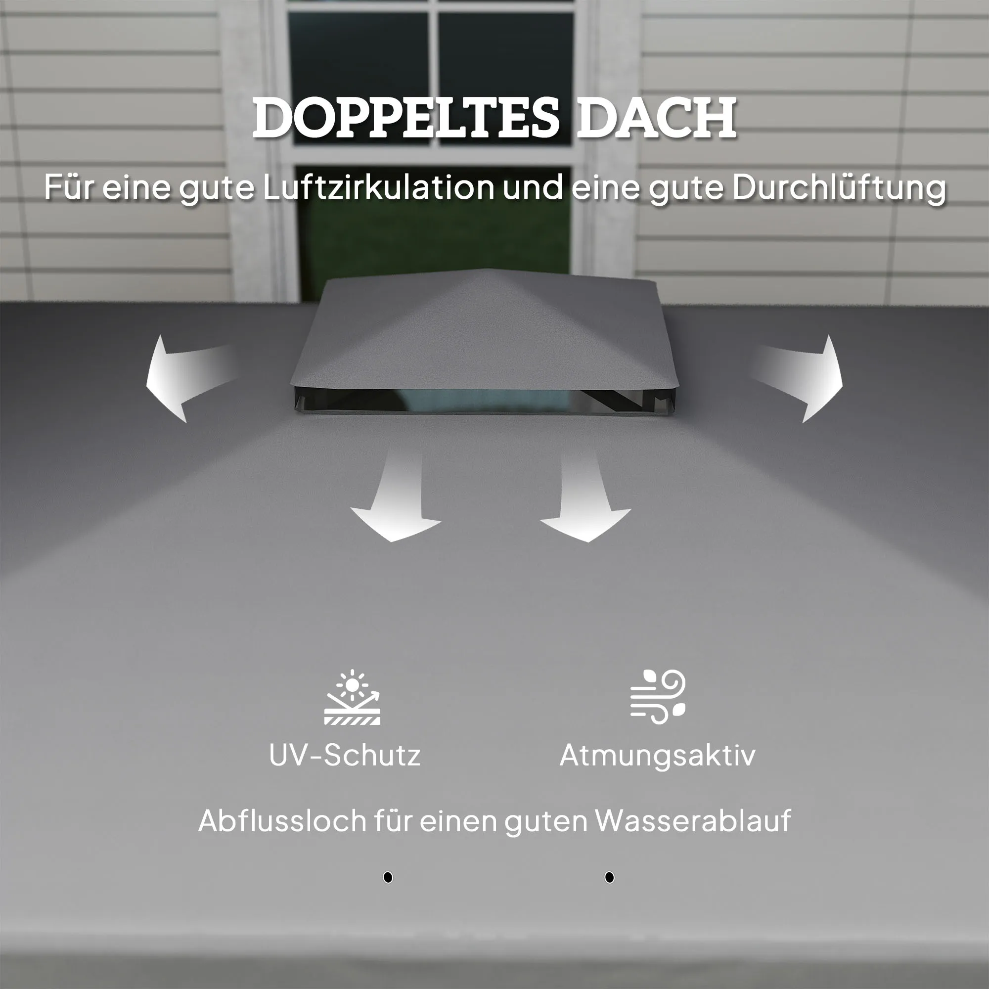 • Optimale luchtcirculatie: dubbellaagse dakbedekking en ingebouwde openingen voor ventilatie