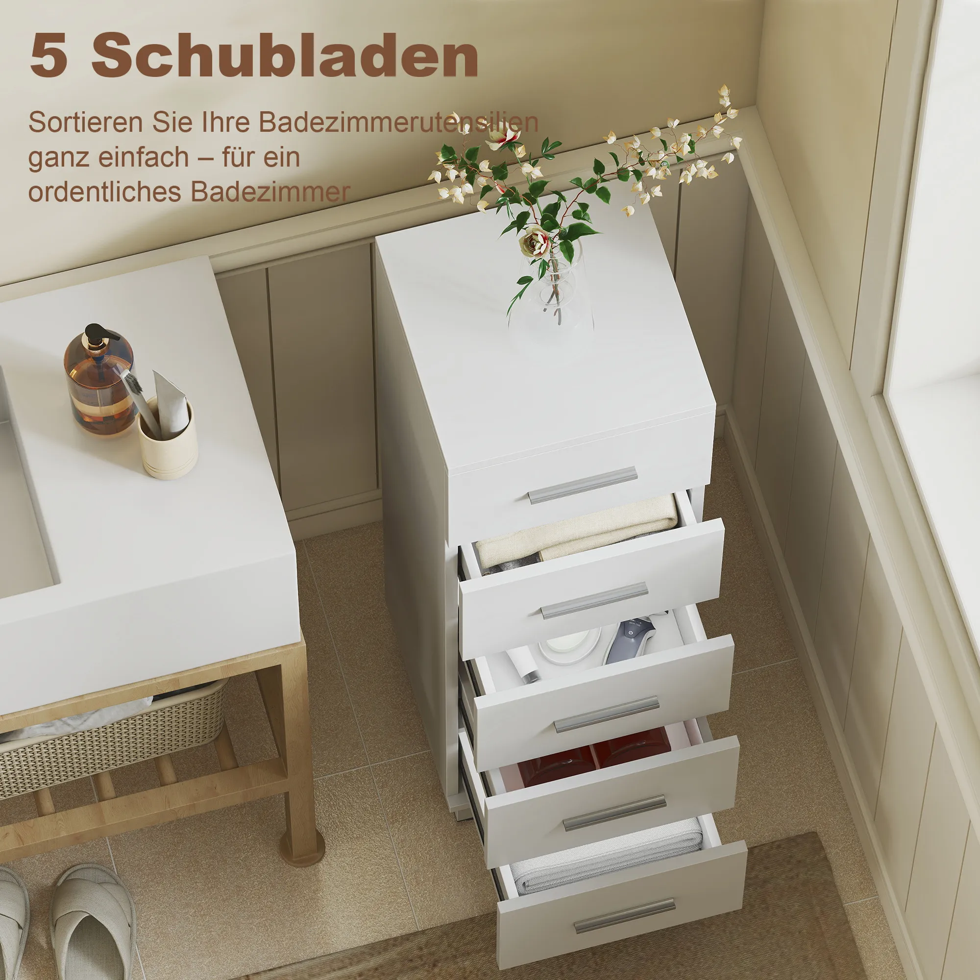 De [BRAND NAME] badkamerkast is jouw stille helper wanneer rommel zijn intrede doet. Toiletartikelen stapelen zich op, handdoeken verdwijnen en de oppervlakken lijken overbelast. Met vijf soepele laden zorgt deze kast voor orde en bergt alles binnen handbereik op. Het elegante witte ontwerp van de opbergkast met zilveren handgrepen geeft jouw badkamer een rustige, frisse sfeer die elke dag plezier brengt.