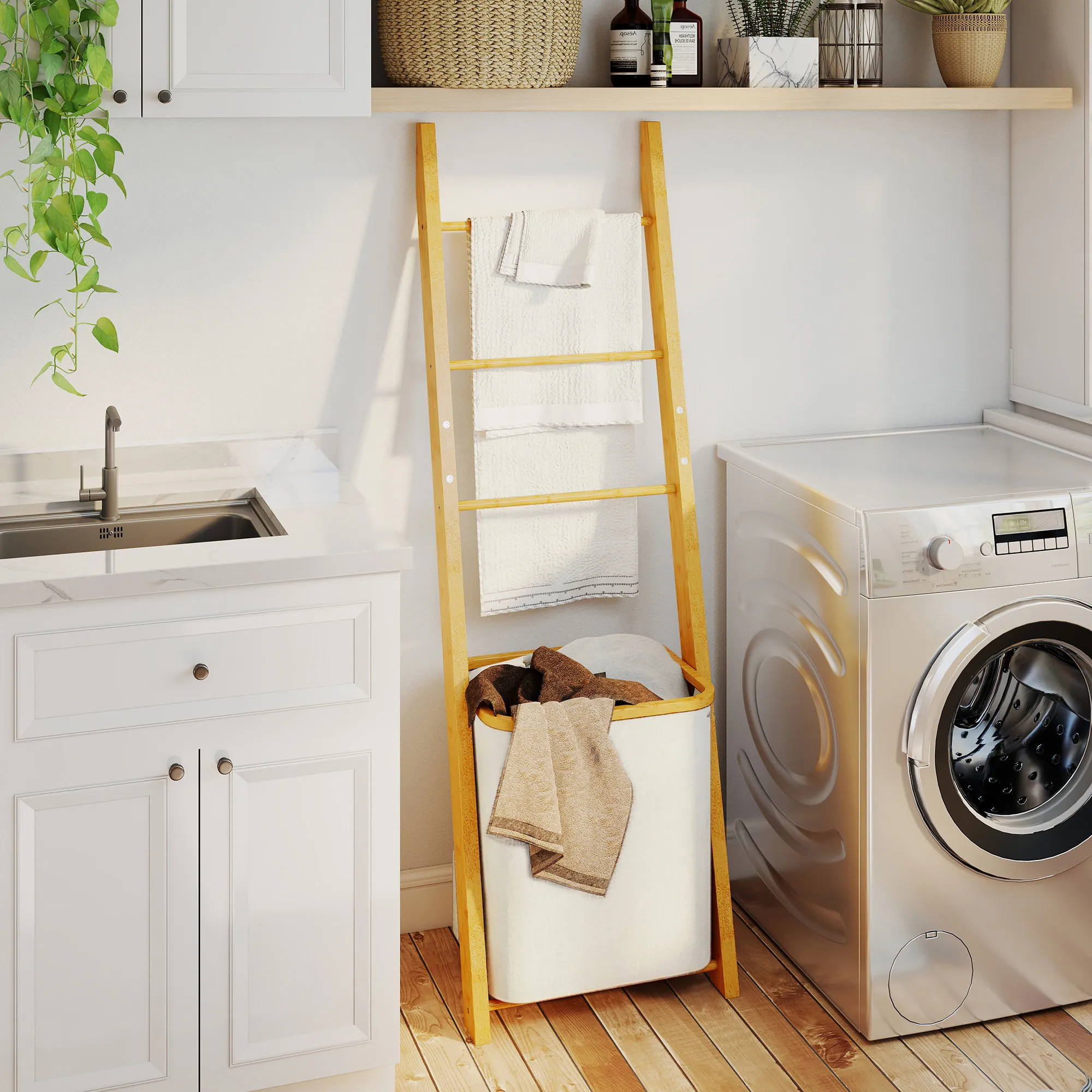 • Praktisch gebruik: drie handdoekstangen en een ruime wasmand voor georganiseerde opslag