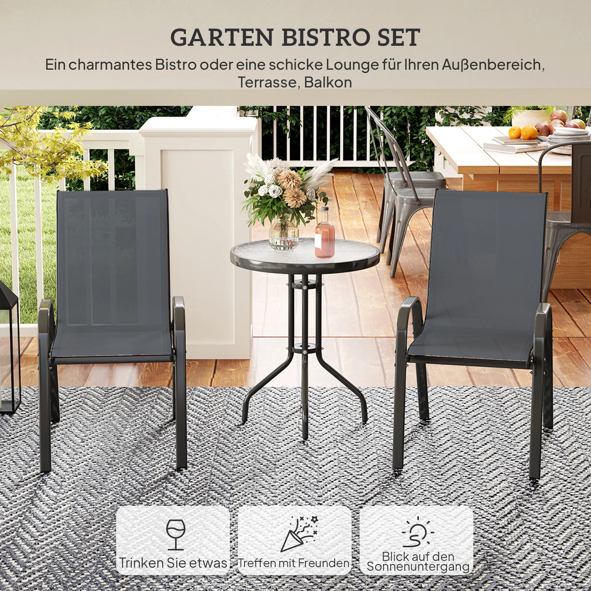 Verrijk je balkon of terras met de [BRAND NAME] balkonmeubelset – een charmante toevoeging aan compacte buitenruimtes. Deze set bestaat uit twee stapelbare stoelen en een ronde glazen tafel. Met stevige stalen frames, ademende mesh-zittingen, hoge rugleuningen en gebogen armleuningen is deze set ideaal voor gezellige gesprekken, ontspanning en genieten van de zonsondergang.