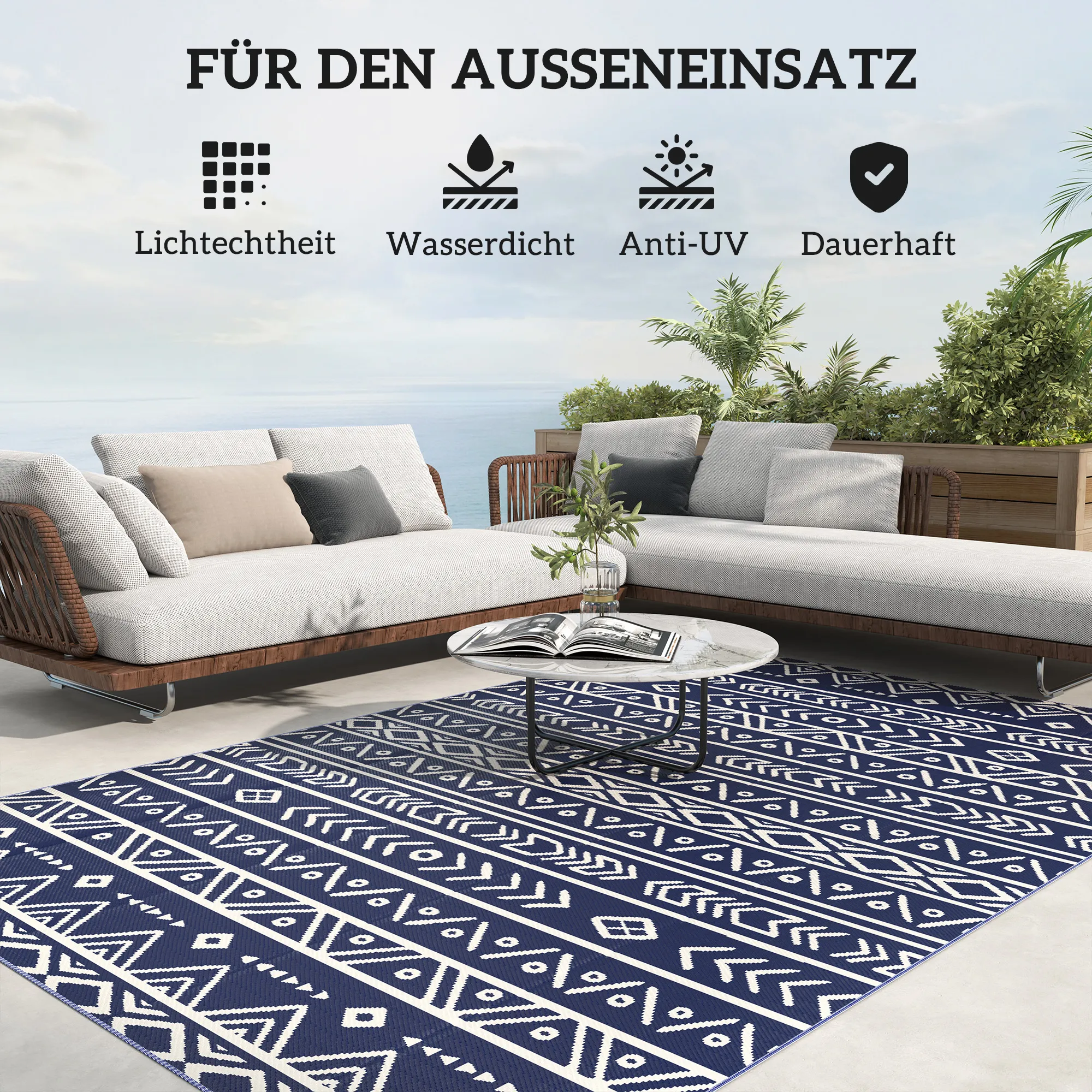 Buiten Tapijt Robuust Weerbestendig Buitentapijt, Tapijt Met Boho-Stijl, Buitentapijt Voor Woonkamer Balkon Tuin Terras Badkamer Hal Keuken, 182 X 274 Cm Blauw+Wit