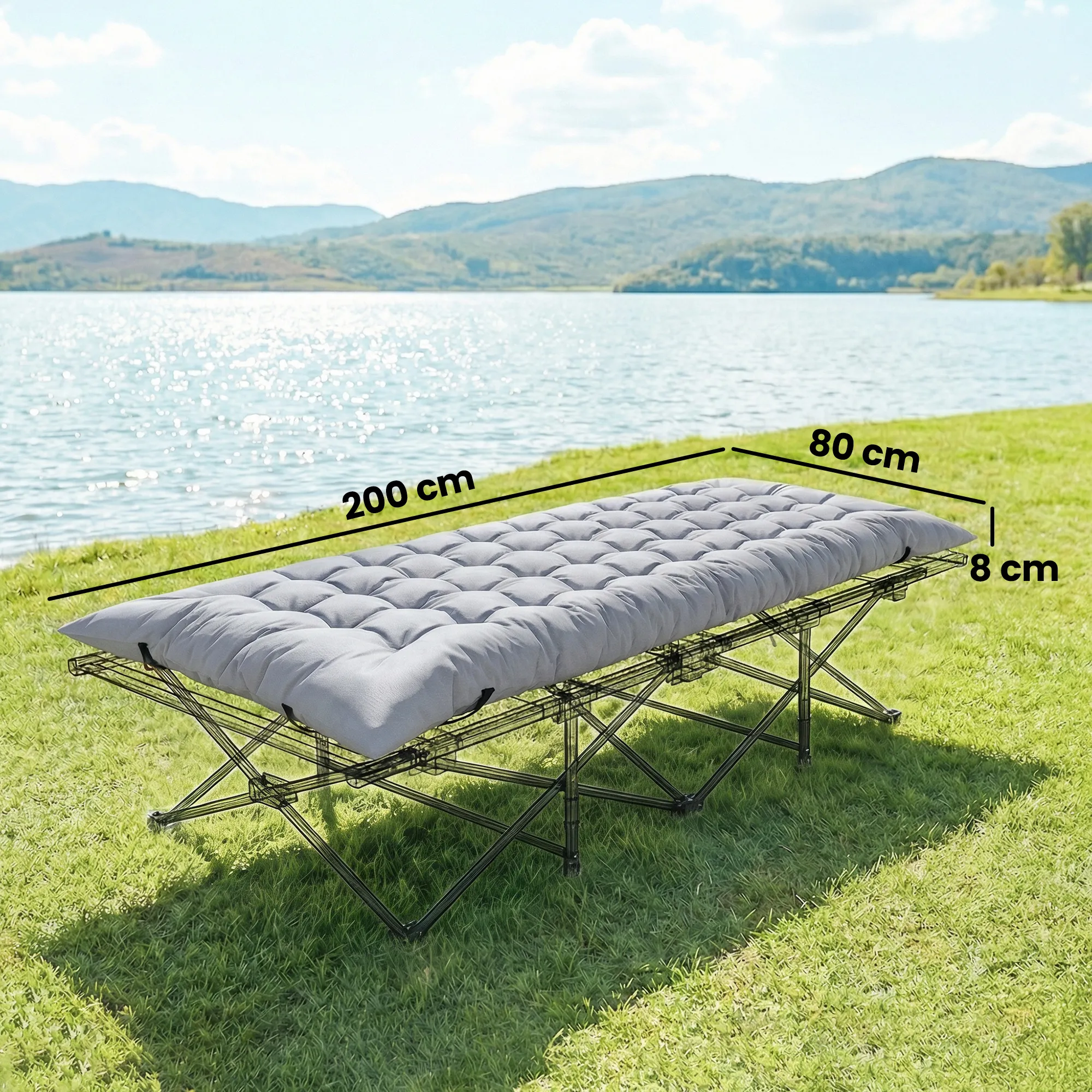 Geniet van superieur comfort in de buitenlucht met de [BRAND NAME] campingmatras. Met een extra dikke 8 cm PU-schuimvulling biedt deze isolatiemat optimale isolatie en veiligheid voor een goede nachtrust tijdens het kamperen. De royale afmetingen van 200 x 80 cm zorgen voor onbeperkte ontspanning, terwijl de vier elastische hoekbanden ervoor zorgen dat de matras stevig op zijn plek blijft op veldbedden. Het gestikte, spatwaterbestendige polyester oppervlak maakt deze matras geschikt voor zowel binnen- als buitengebruik. Dankzij het compacte formaat is de matras gemakkelijk te transporteren en op te bergen, zonder dat er montage nodig is.