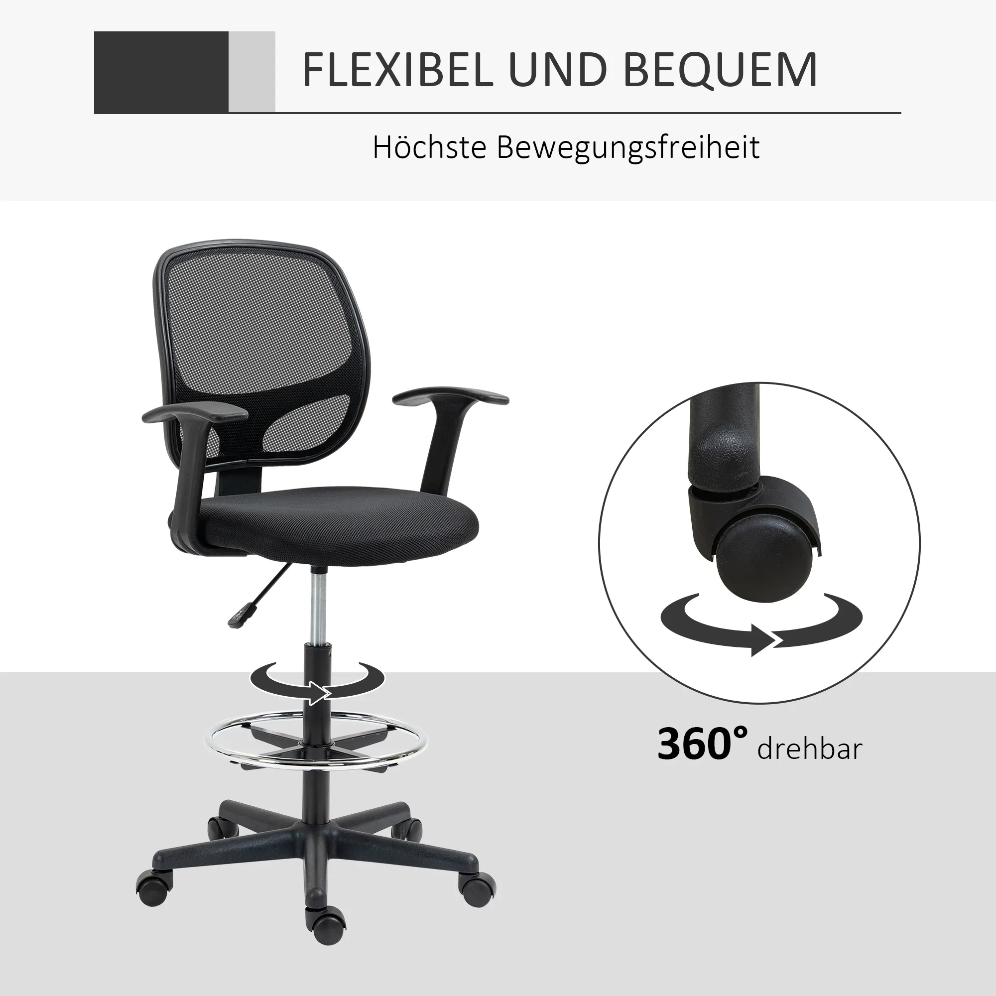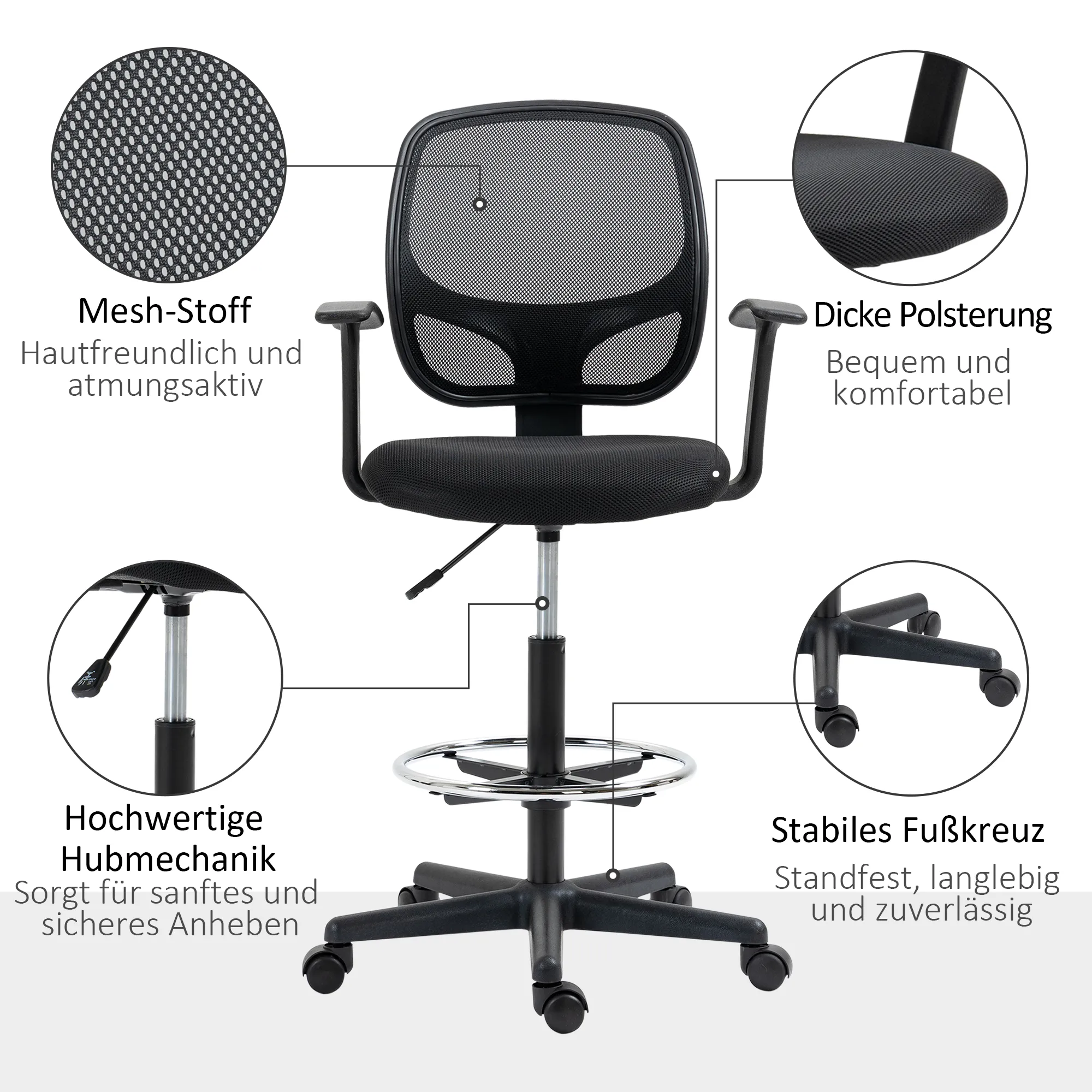 Ergonomische Bureaustoel, Draaistoel, Tekentafelstoel, Verstelbare Voetring, Tot 120 Kg, Zwart, 60x56x110-132 Cm