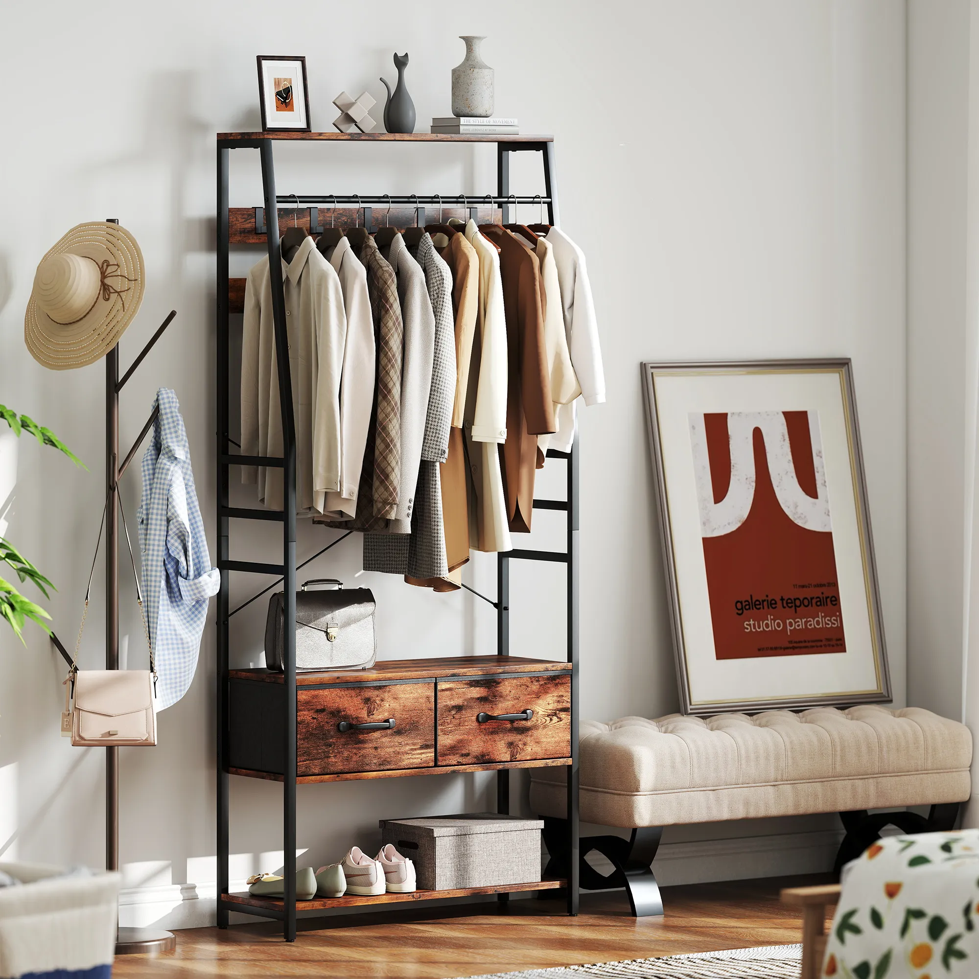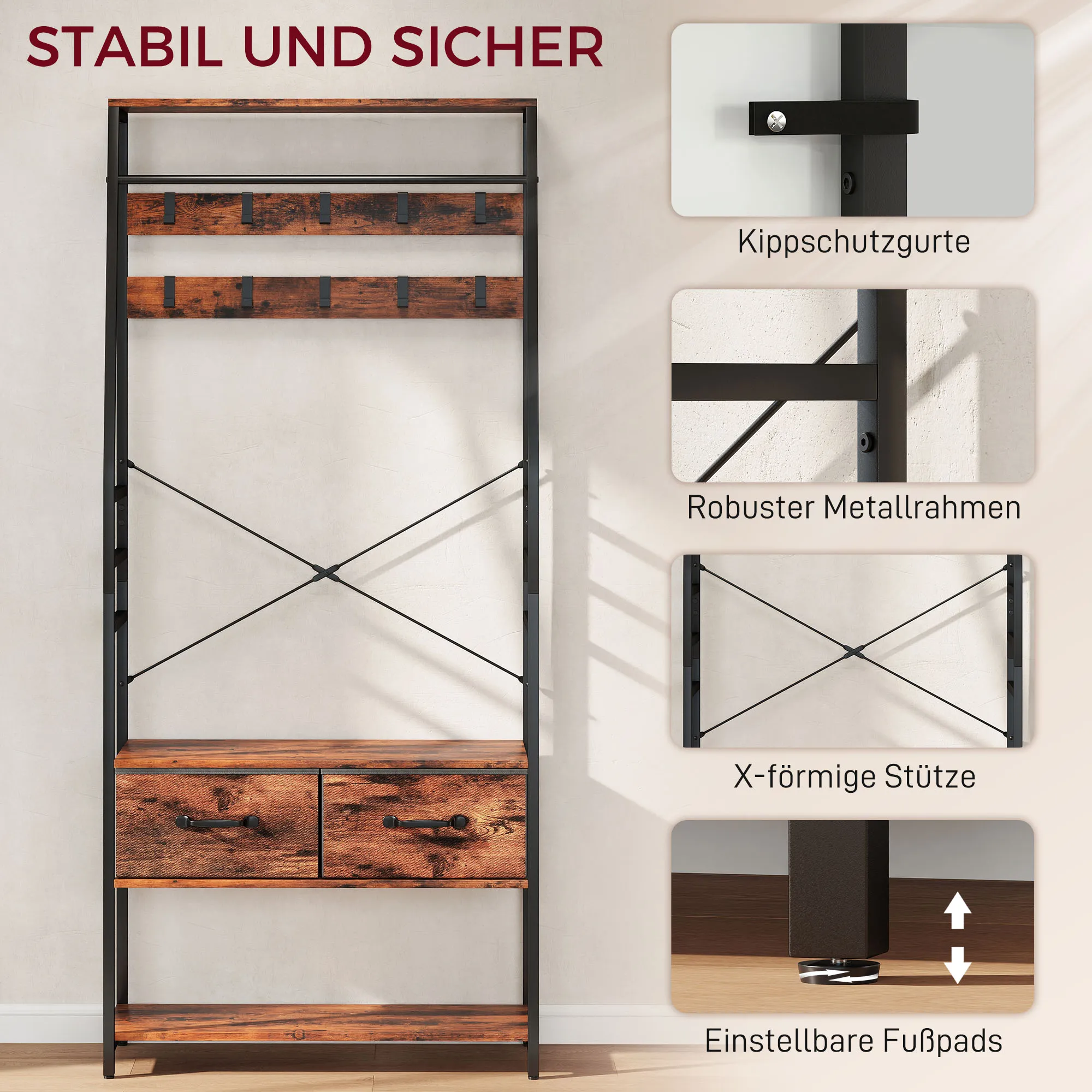 - 6-in-1 Design: combineert een kledingstang, een schoenenbank, een schoenenrek, een opbergvak, stoffen laden en kledinghaken