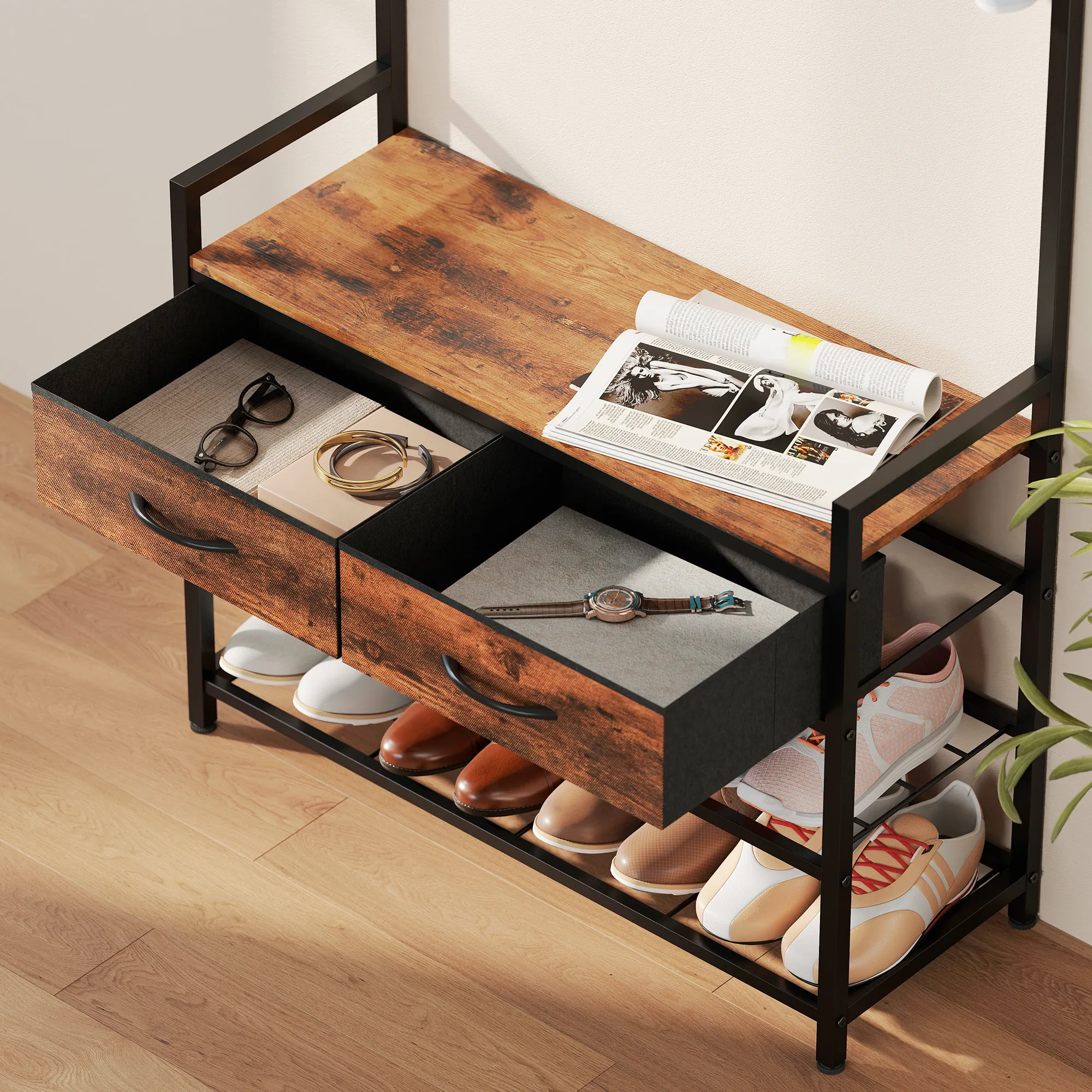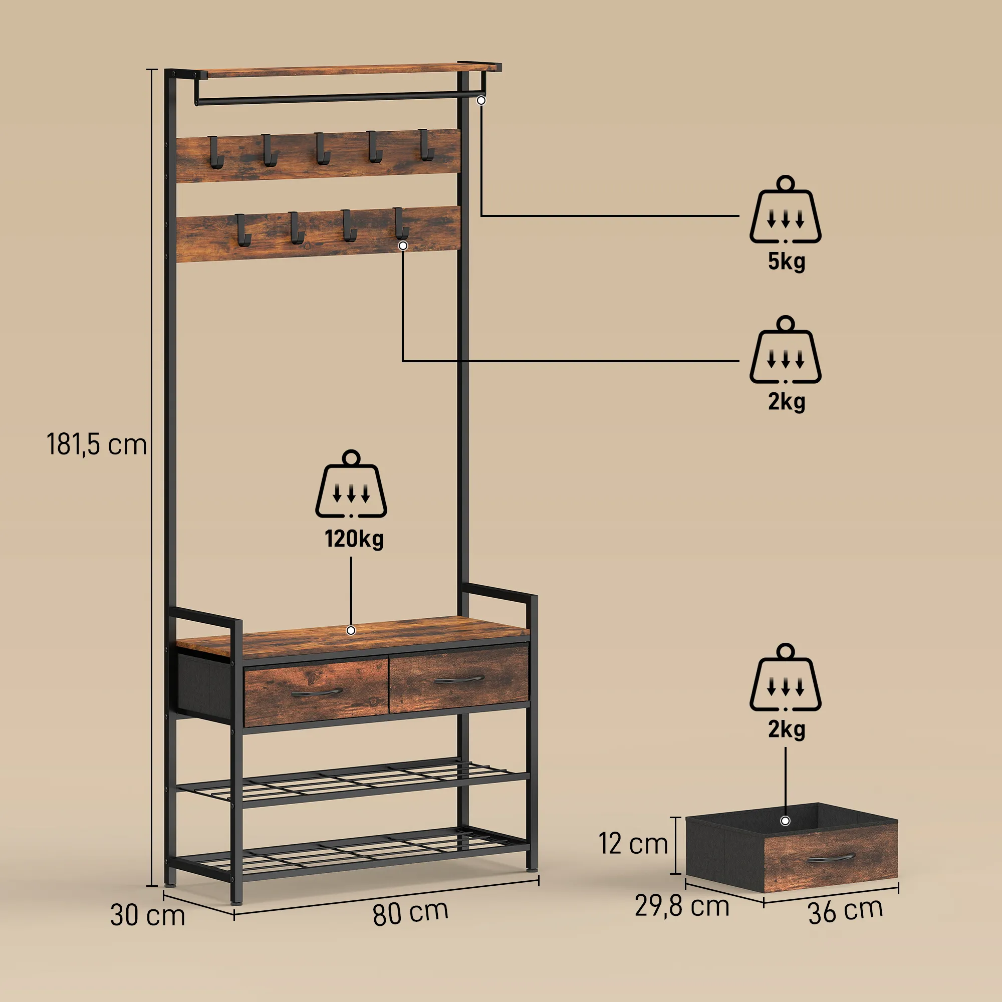 Garderobestandaard Met Kledinghaken, Schoenenbank, Industriële Entree-organizer, Stalen Frame, Rustiek Bruin