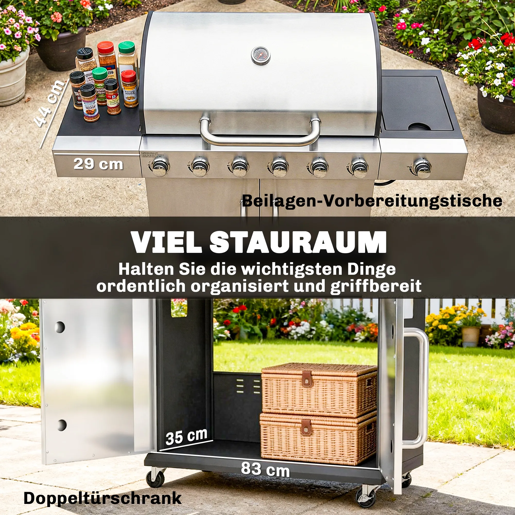Gasgrill 18,6 KW 6+1 Brander BBQ Grillwagen Gemaakt Van Roestvrij Staal Inclusief Rolthermometer, Warmhoudrooster, Zijtafel, Onderkast