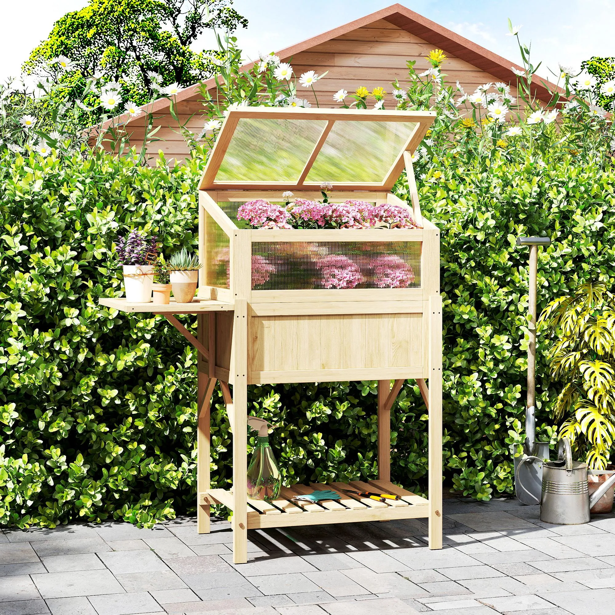 Hoog Bed Met Vroegbeetopzetstuk Van Hout, Plantenbak Met Inklapbaar Broeikas, Zijtafel Opbergvak Natuurhout