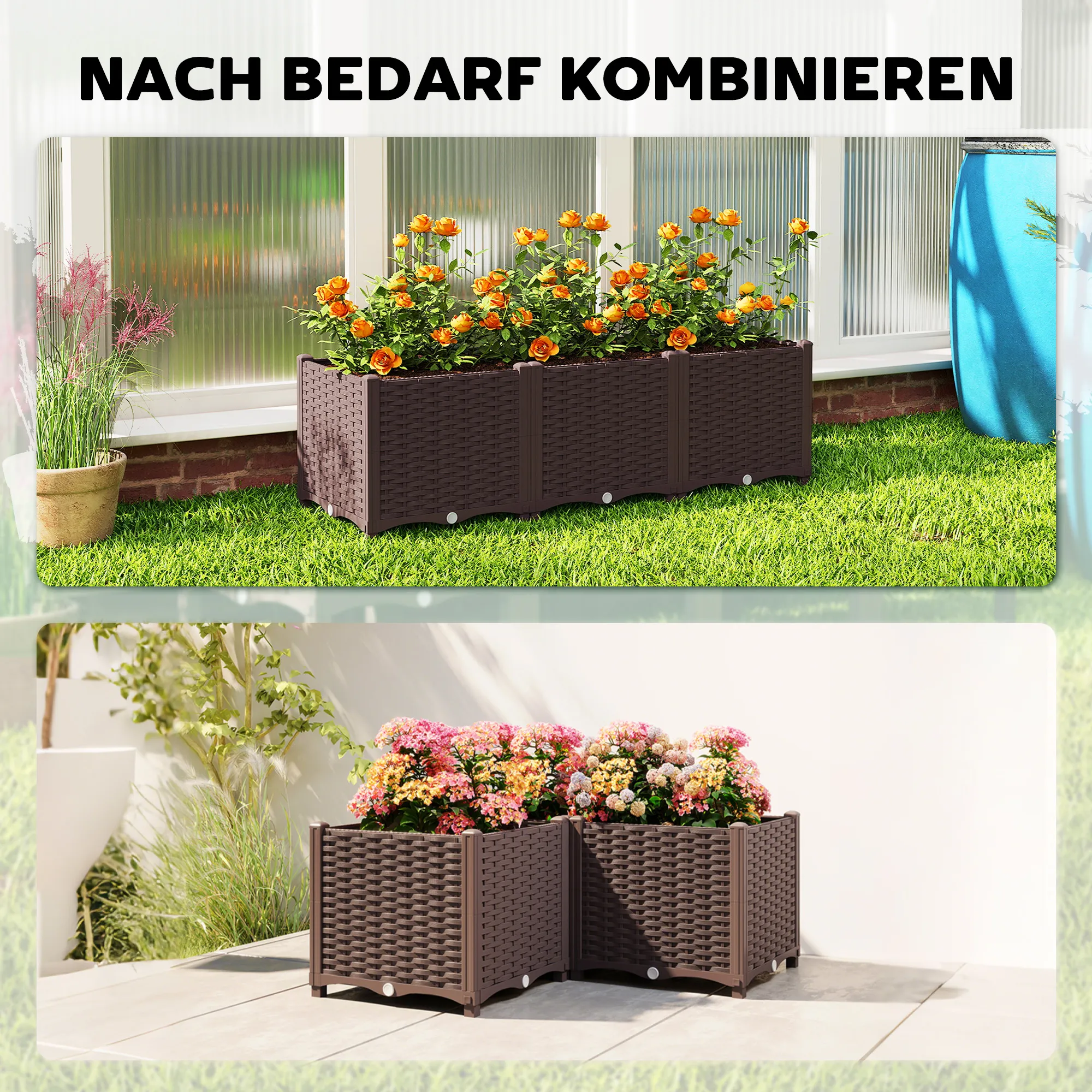 Met het modulaire verhoogde bed van [BRAND NAME] creëer je gemakkelijk een unieke indeling met drie plantenbakken die perfect passen bij jouw ruimte. Dit innovatieve bed lost het probleem op van vaste en omvangrijke plantenbakken. Dankzij de ingebouwde wateropslag en meerdere afvoergaten is het eenvoudig om de vochtigheid te controleren, waardoor de grond gehydrateerd blijft in de zomer en wortelrot wordt voorkomen. De stevige kunststof constructie met rattan-look geeft terrassen, balkons of kleine tuinen een decoratieve uitstraling.