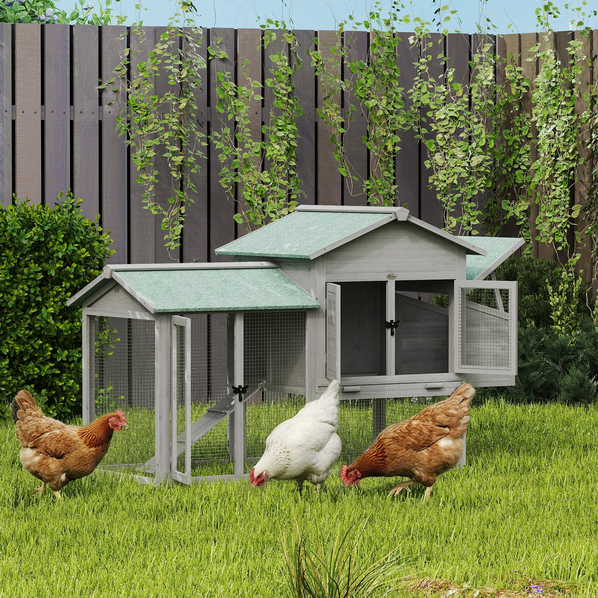 Geef je pluimvee een comfortabele leefruimte met het [BRAND NAME] kippenhok! Dit gezellige hok biedt een huiselijke binnenruimte en een ruime ren voor je dieren. Het bovenste gedeelte zorgt voor privacy en rust, terwijl het onderste meer bewegingsruimte biedt. Met een interne helling voor snelle toegang, afsluitbare deuren en een uitschuifbare lade voor eenvoudig schoonmaken en voeren. Het dak van de nestkast kan worden geopend om eieren te verzamelen.