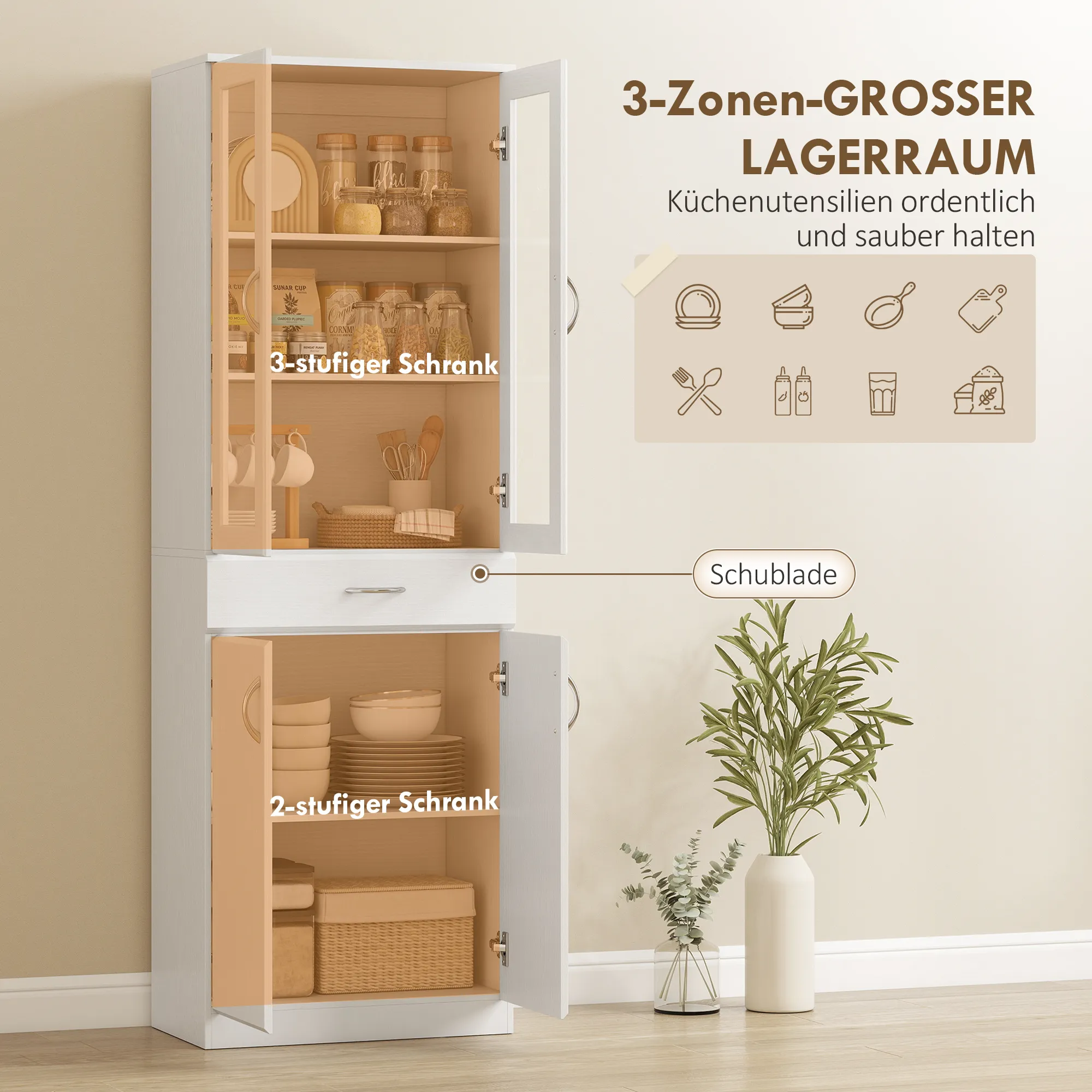 Heb je ook genoeg van het lawaai van dichtslaande kastdeuren en de chaos in je keukenkasten? De [BRAND NAME] keukenkast biedt de oplossing! Met zijn slimme indeling in drie zones en verstelbare rekken houd je alles georganiseerd, van borden tot grote pakken ontbijtgranen. De zacht sluitende scharnieren zorgen voor rust en brengen comfort terug in jouw huis.