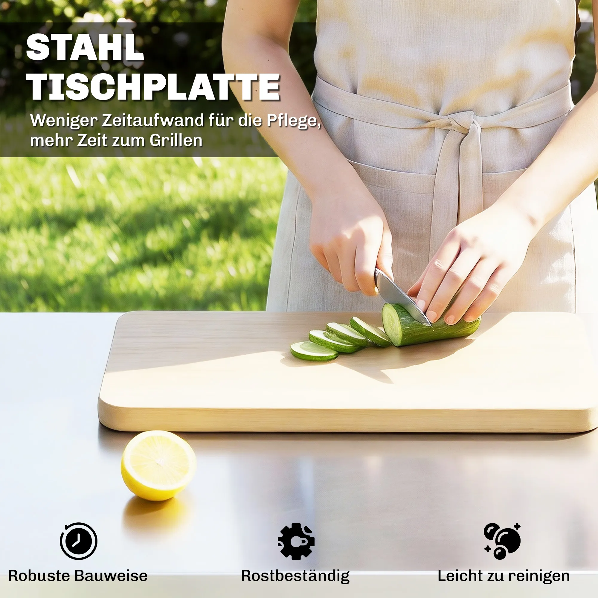 Wil je je buitenkookruimte georganiseerd houden en genieten van moeiteloze familie-BBQ’s? De grillwagen van [BRAND NAME] is de oplossing! Met een ruim roestvrijstalen oppervlak, een handige tussenplank voor kruiden, en een grote kast om alles netjes op te bergen, maakt deze grilltafel je bijeenkomsten op het terras weer plezierig en stressvrij.