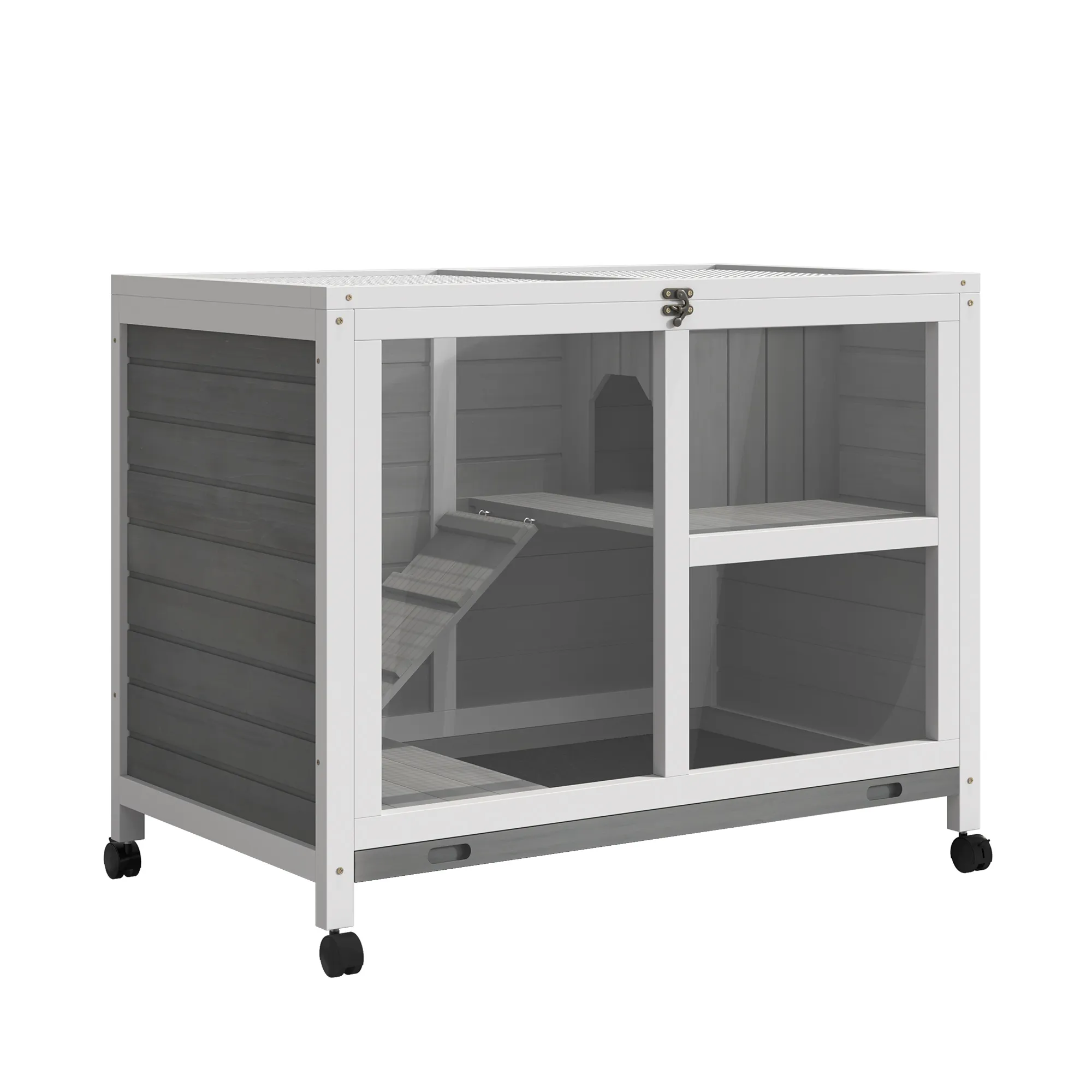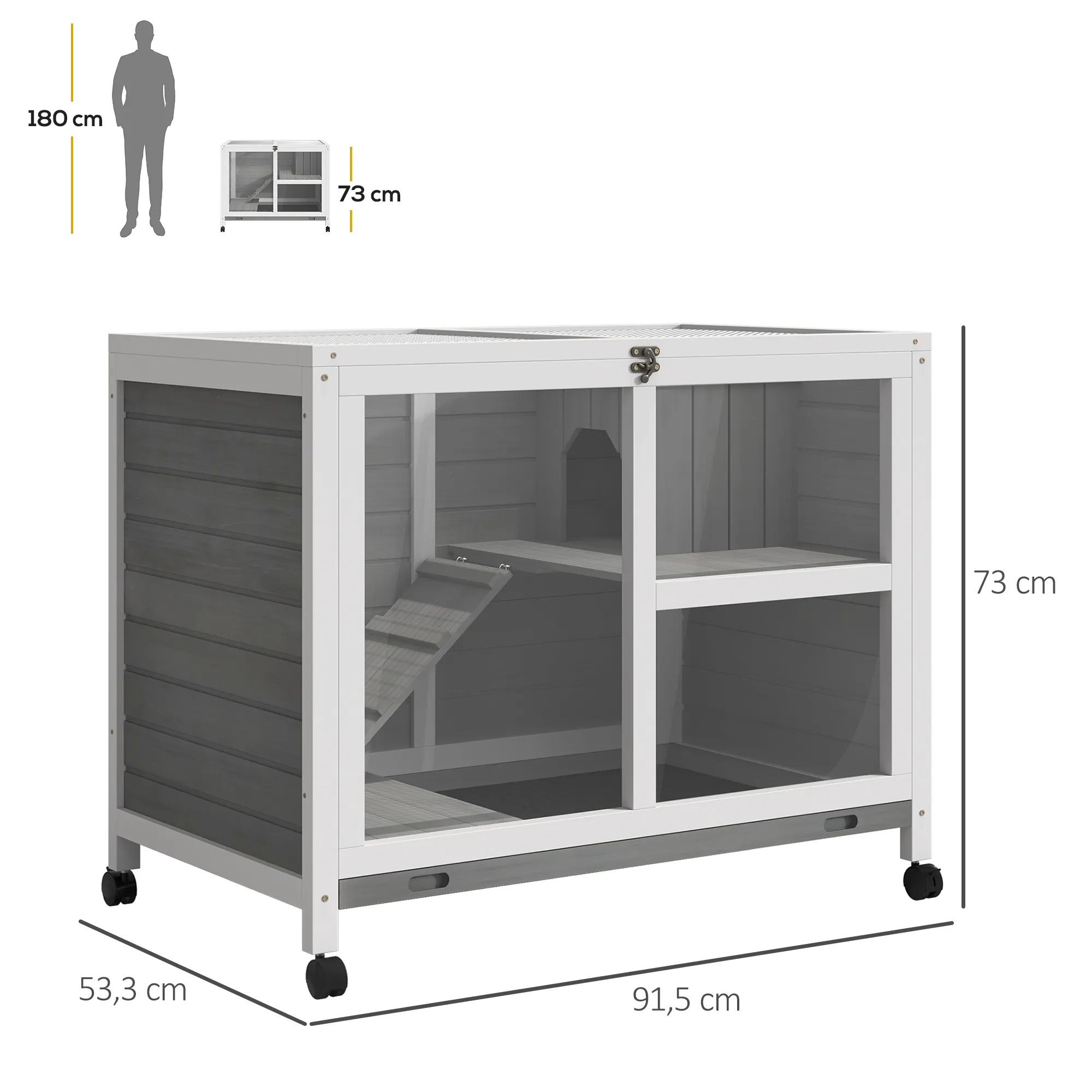 In dit kleine dierenhok van [BRAND NAME] kunnen jouw kleine dieren op 2 niveaus eten, spelen en slapen. Dankzij de helling kunnen jouw huisdieren gemakkelijk van het onderste naar het bovenste gedeelte gaan. Het opklapbare dak en de uitneembare bodemlade maken het schoonmaken eenvoudig. Dit kleine dierenhok is het ideale thuis voor jouw kleine dieren.