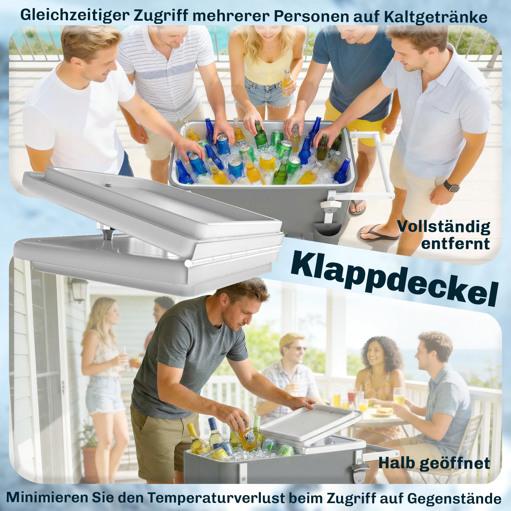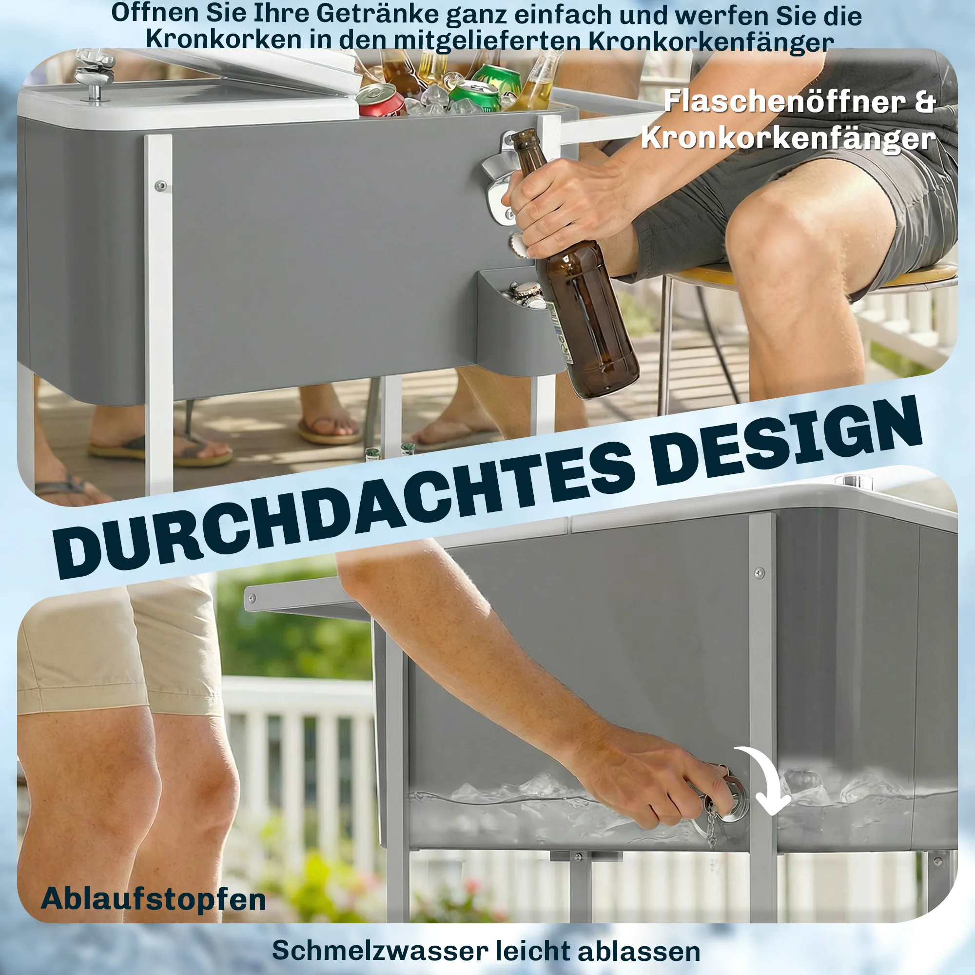 Dankzij de handige afvoerplug is het schoonmaken en waterafvoer een fluitje van een cent. Met de vier wielen van de koelwagen kun je hem eenvoudig verplaatsen, waarvan er twee vergrendelbaar zijn. De koelwagen beschikt over een onderste plank voor extra opbergruimte voor accessoires en snacks, en wordt geleverd met een handige flesopener en doppenvanger voor het ultieme feestgemak.