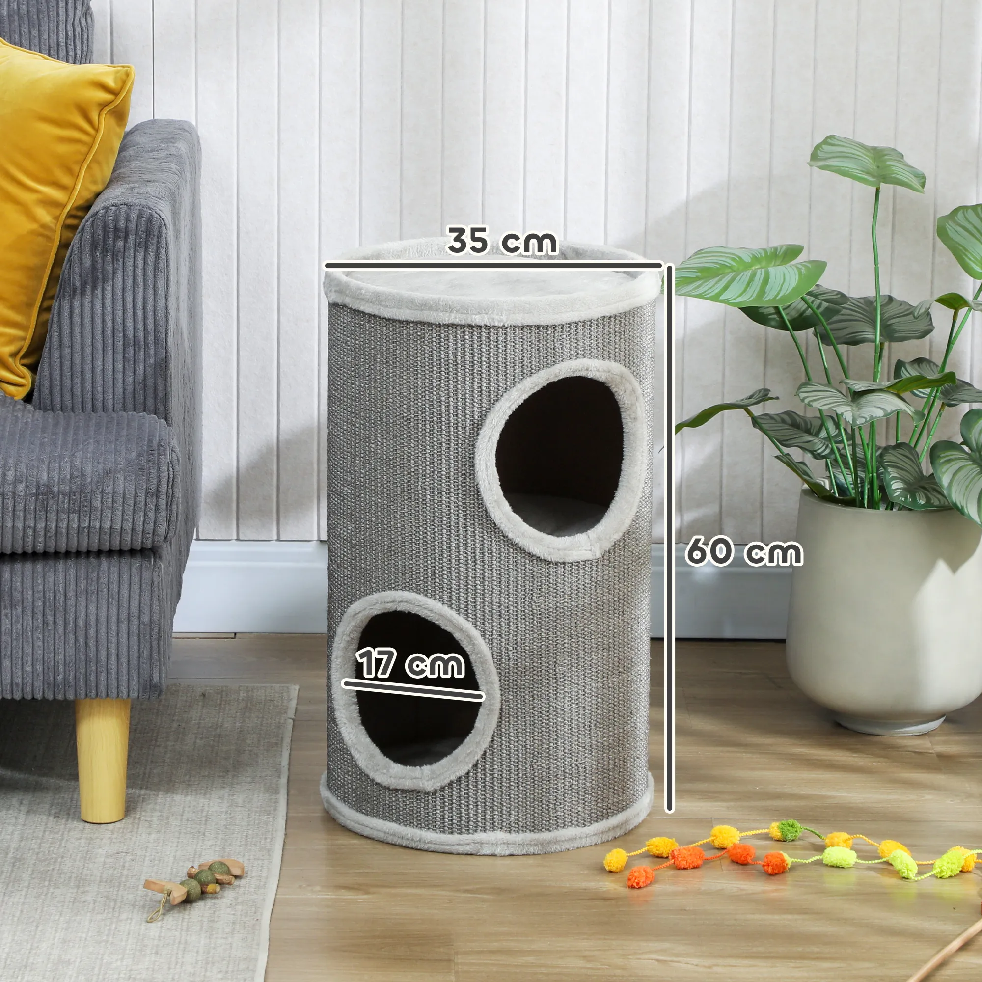 Krabton, 60 Cm Hoog Ø 35 Cm Tweelaagse Kattenton Met 2 Grotten, Pluche Rand, Voor 1-2 Katten Tot 5 Kg, Lichtgrijs