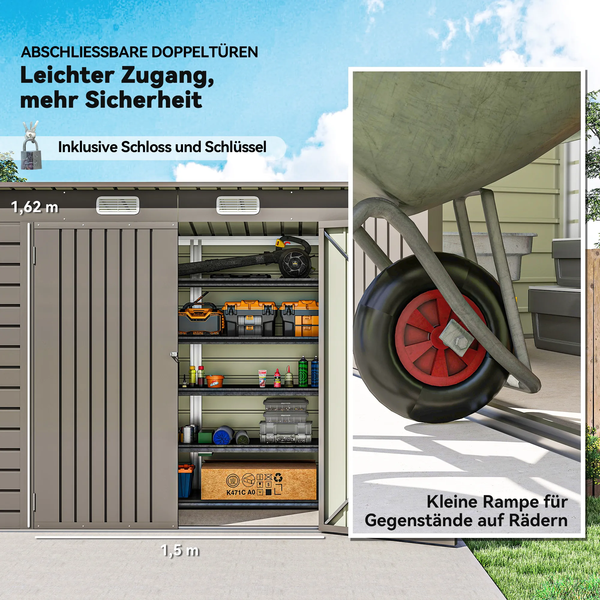 • Veilige opslag: stevige metalen constructie voor tuingereedschap, gereedschap en meer