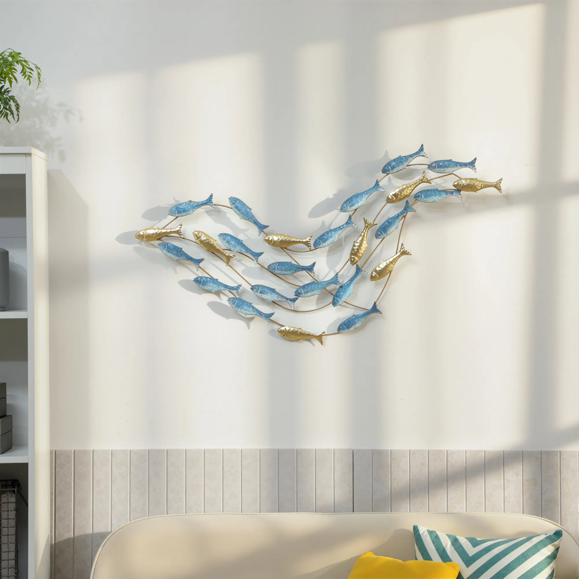 Wil je jouw woonkamer omtoveren tot een levendige en elegante ruimte? Dan is dit metalen wandkunstwerk van [BRAND NAME] de perfecte keuze voor jou. Het grote formaat en moderne ontwerp met blauwe en lichtgouden vissen langs sierlijke gouden lijnen zorgen voor een boeiend middelpunt in huis.