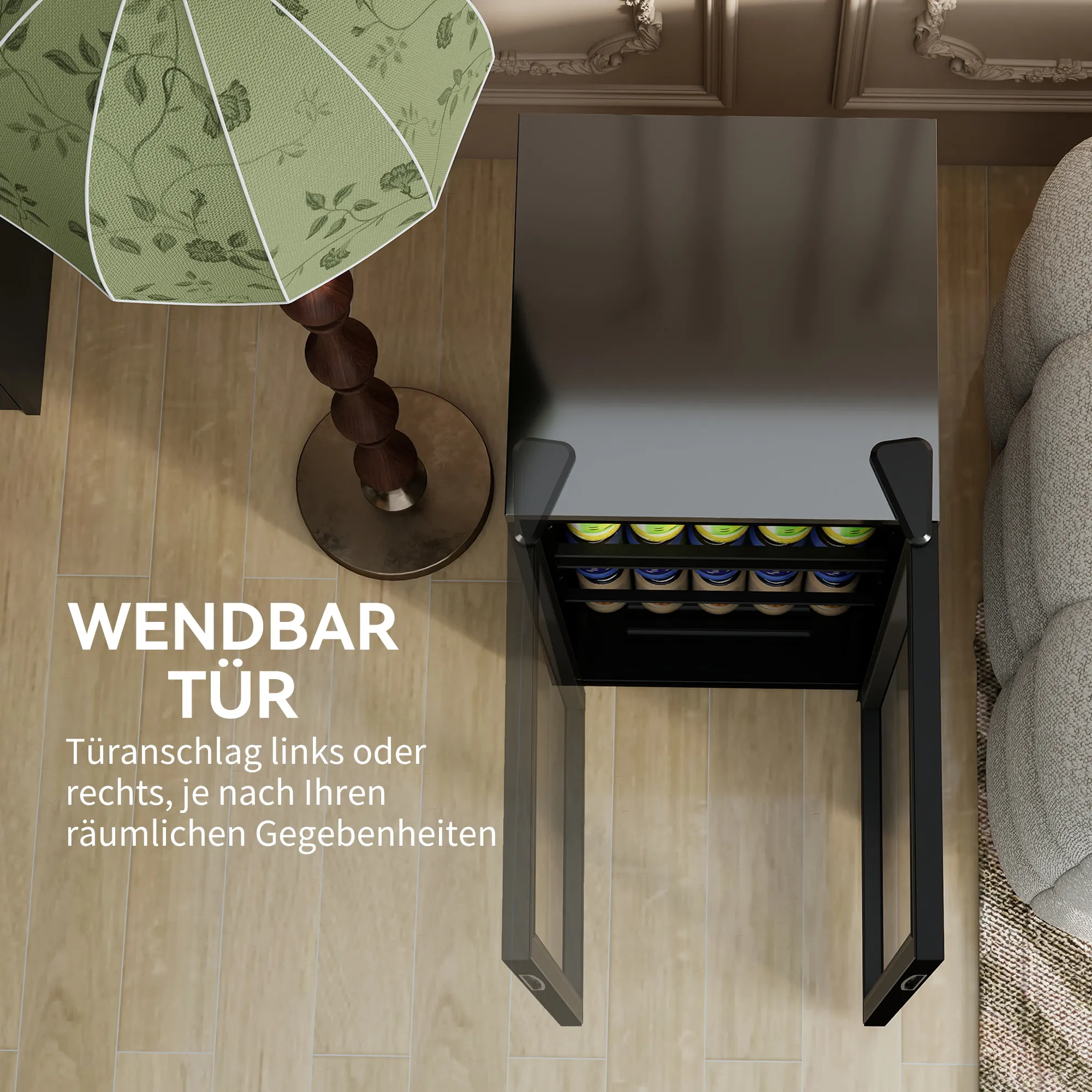 - Flexibele opslag: vier verstelbare rekken voor flessen en blikjes