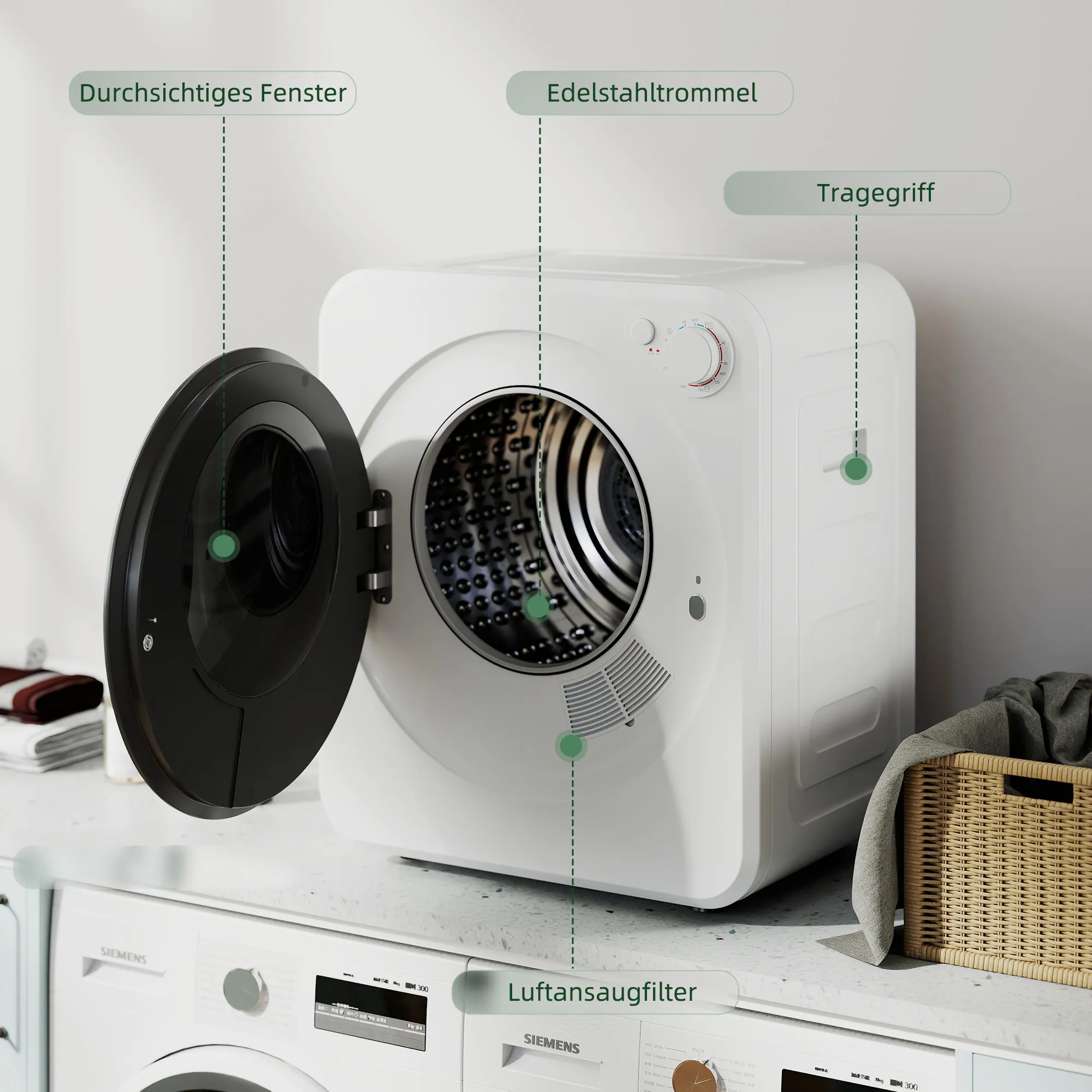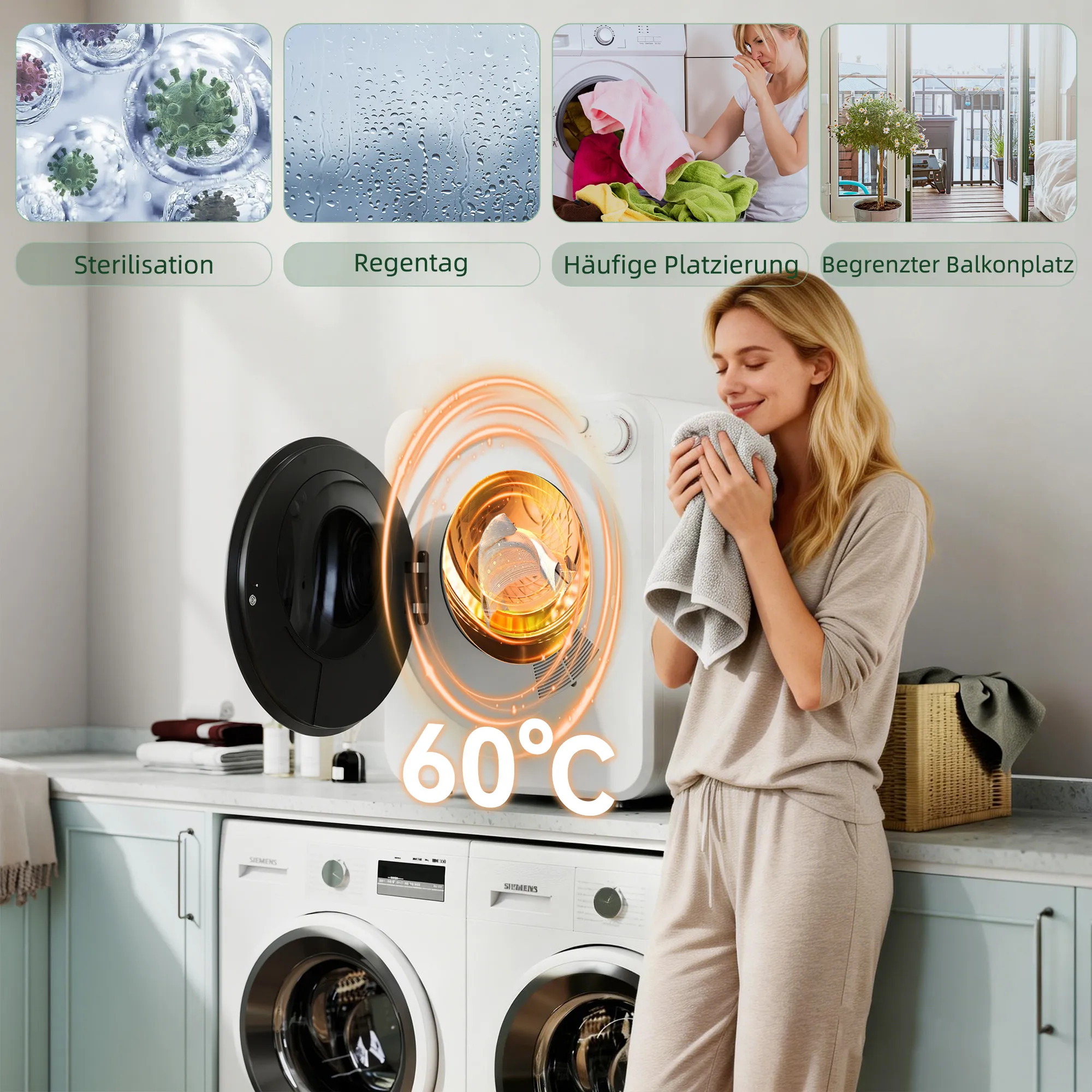 Heb je last van vochtige was die je kleine ruimte in beslag neemt, waardoor je kleding stijf wordt en mogelijk irriterende stoffen bevat? De dagelijkse strijd om frisse, schone kleding kan frustrerend zijn. De Wäschetrockner van [BRAND NAME] biedt de ideale oplossing. Met compacte afmetingen van 48B x 44D x 57H cm past hij overal en zorgt het 60℃ programma voor gedesinfecteerde stoffen. Perfect voor delicate kleding, garandeert het bij elke cyclus zachte, hygiënisch schone kleding.