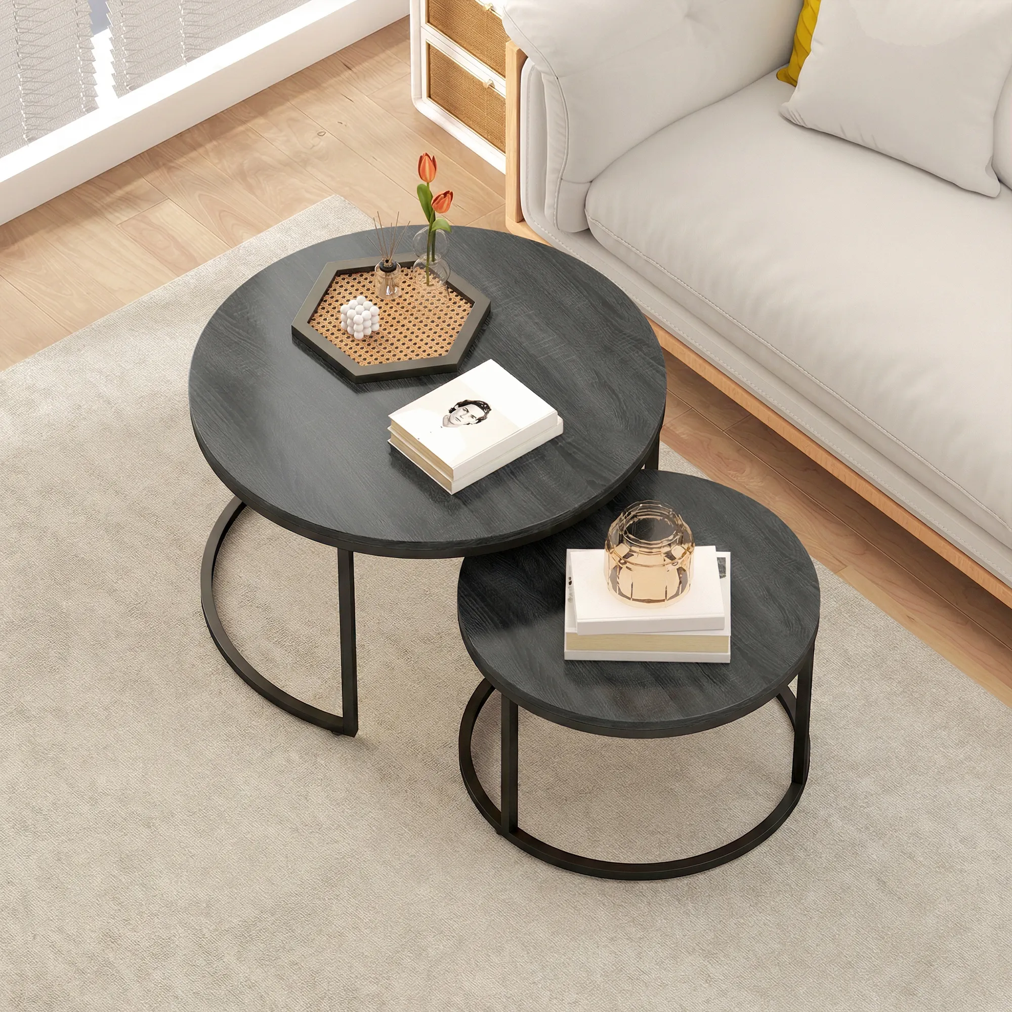 Modern Koffietafel 2-Delig Set, Stapelbare Bijzettafels Met Metalen Frame Voor Woonkamer, Slaapkamer, Kantoor, Zwart