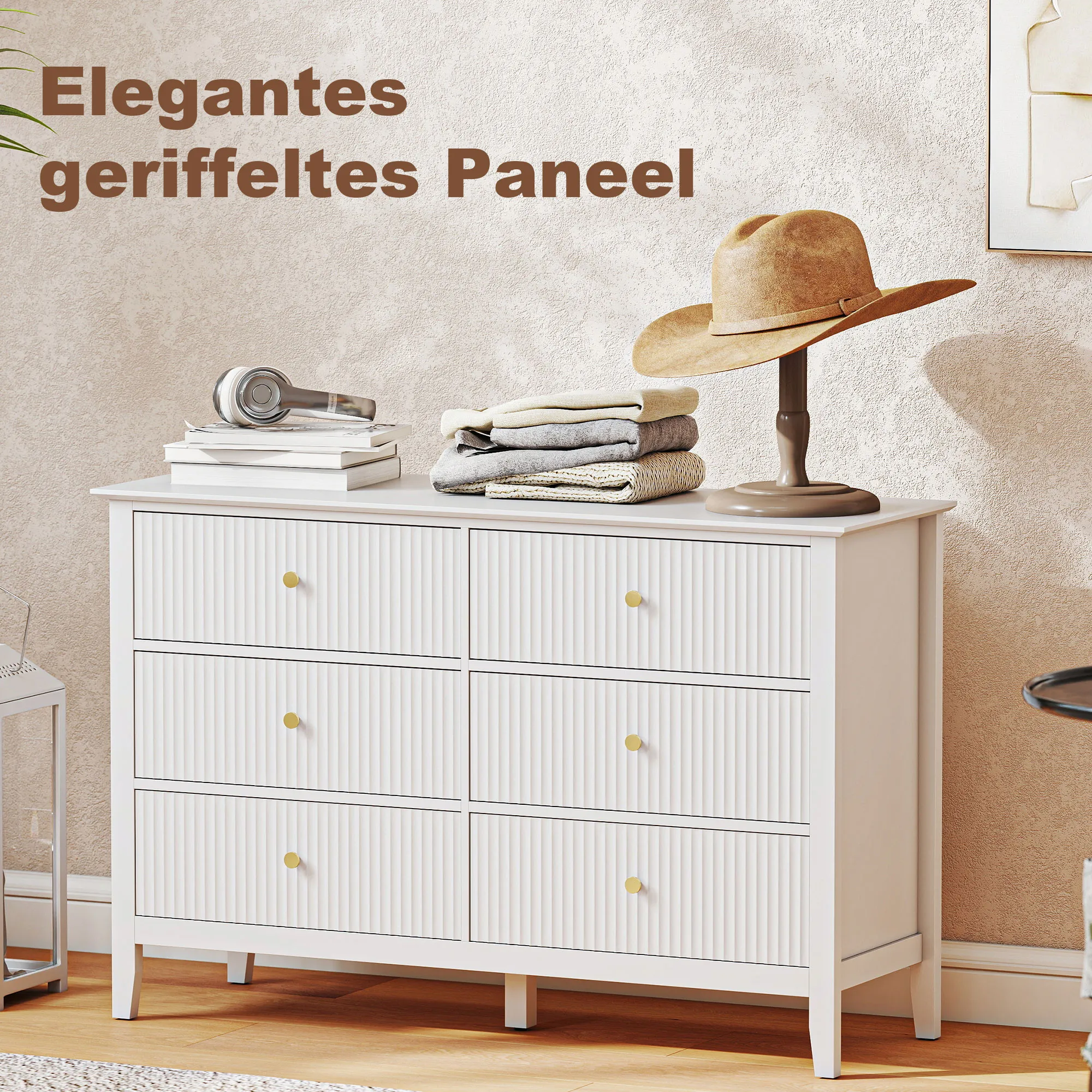 Maak van jouw onrustige slaapkamer een oase van rust met de [BRAND NAME] ladekast met zes laden en een royaal oppervlak. De gevleugelde fronten en goudkleurige handgrepen geven een moderne charme aan dit dressoir, terwijl het versterkte frame, verstelbare voeten en kantelbeveiliging zorgen voor een stijlvol, goed georganiseerd huis.