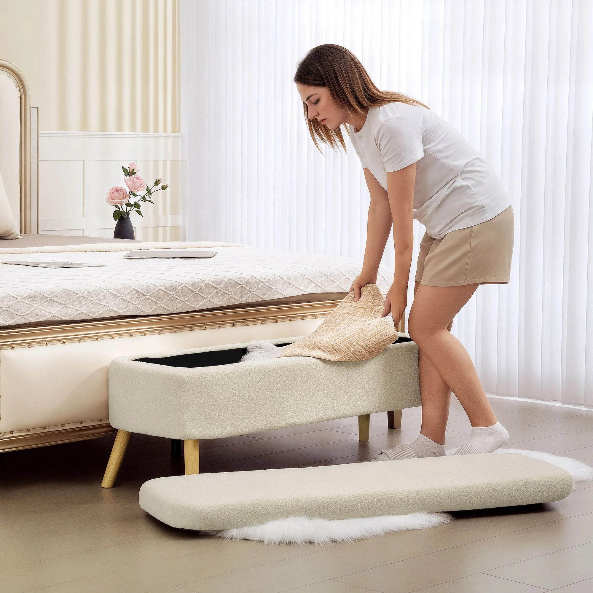 Opbergbank, Zitbank Met 65 L Opbergruimte, Teddy-vliesstof, Rubberhout, 120 X 42 X 45 Cm, Beige