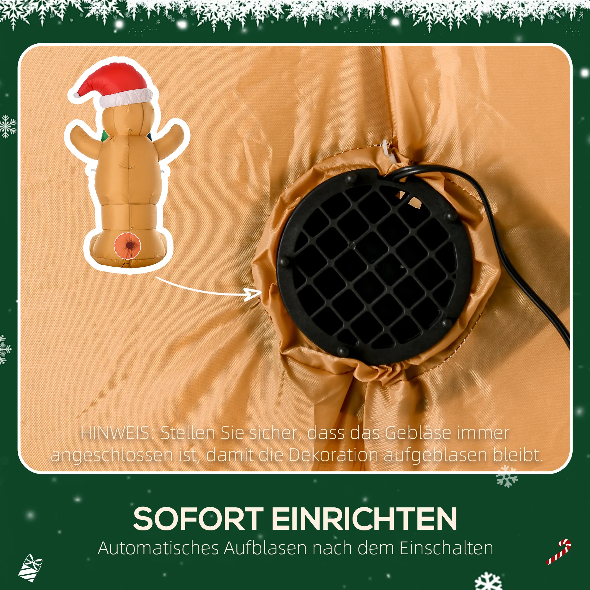 Laat de magie van Kerst je tuin betoveren met de opblaasbare TRUUSK kerstdecoratie. De ingebouwde LED-lampjes van deze charmante, reusachtige peperkoekman zorgen voor een warme en uitnodigende sfeer die zowel jong als oud zal aanspreken. In slechts enkele minuten blaas je deze buiten kerstdecoratie op met de bijgeleverde inflator en tover je je buitenruimte om tot een stralende oase van welzijn!
