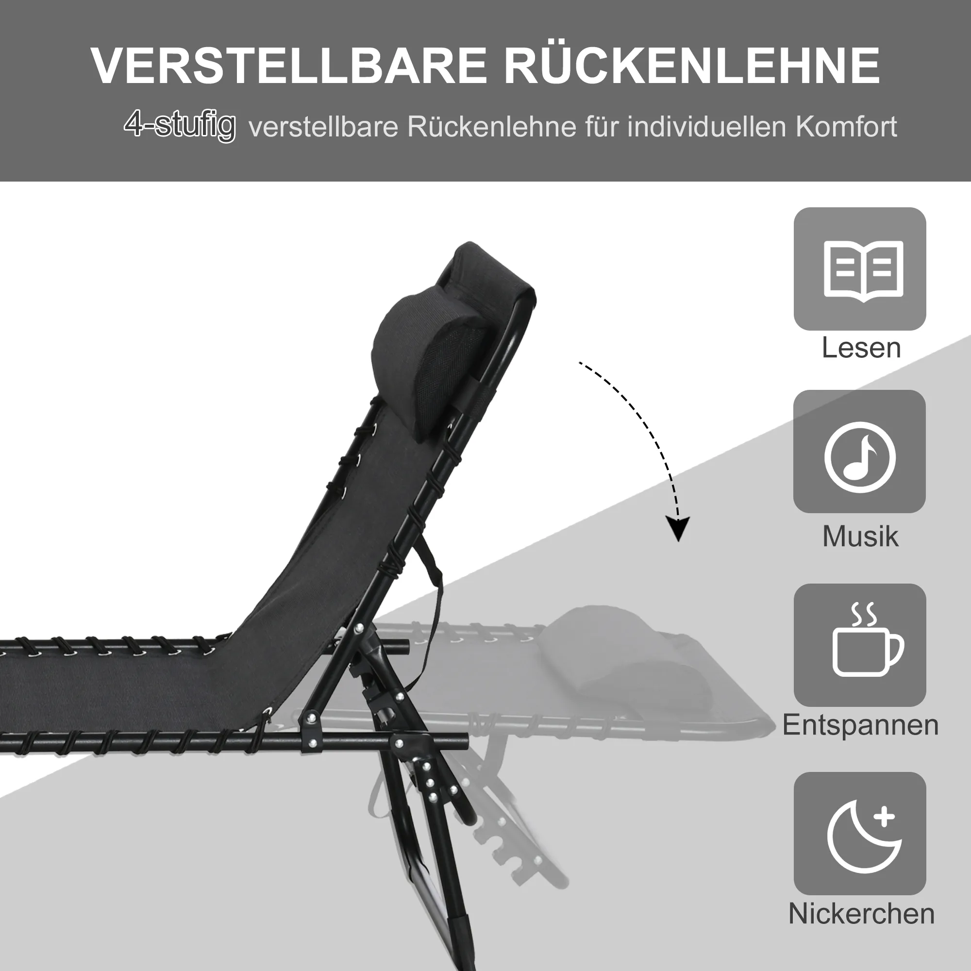 • Comfortabel design: volledig verstelbaar met 4 rugleuning- en 2 voetsteunposities