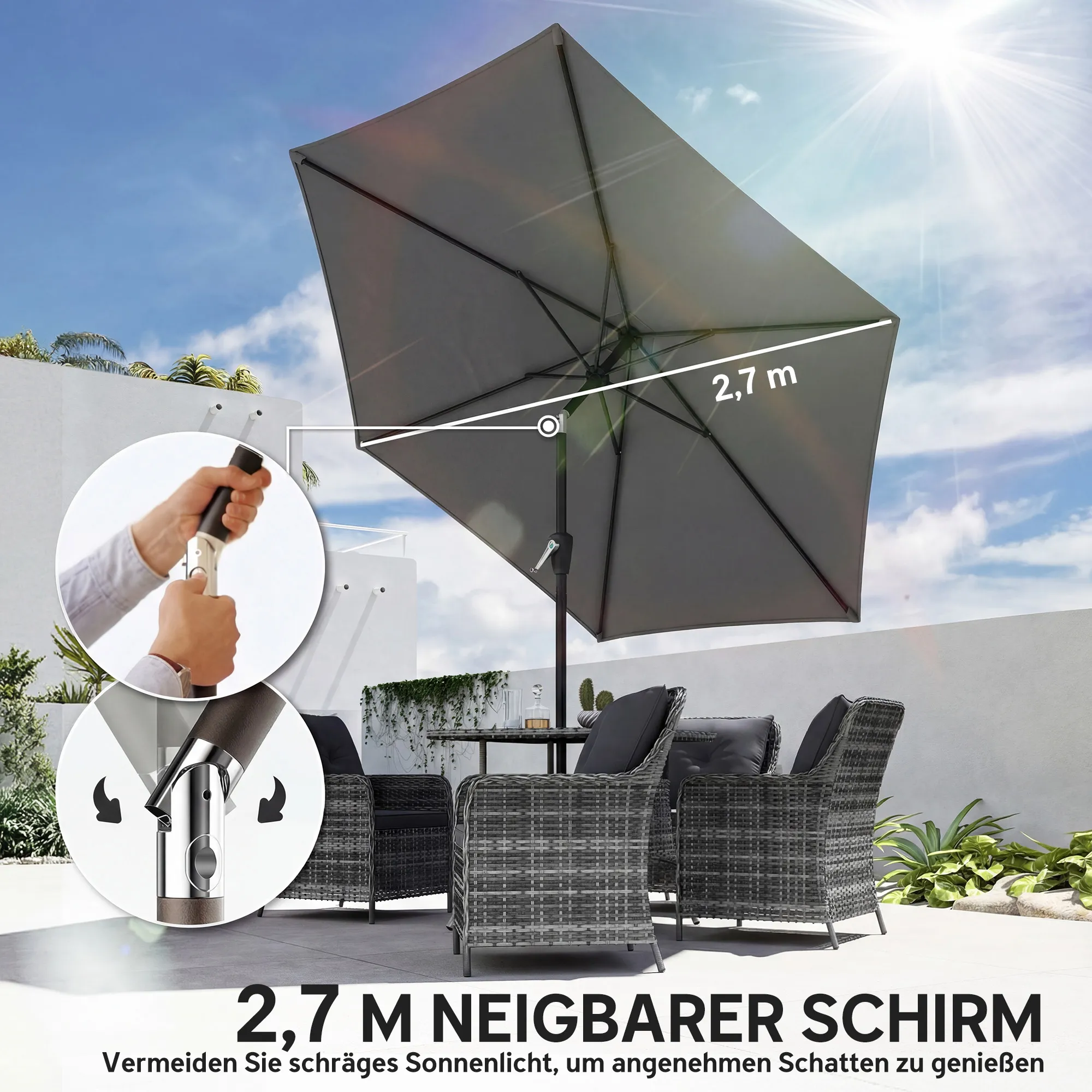 • Gebruiksgemak: gladde handkruk opent en sluit de parasol moeiteloos