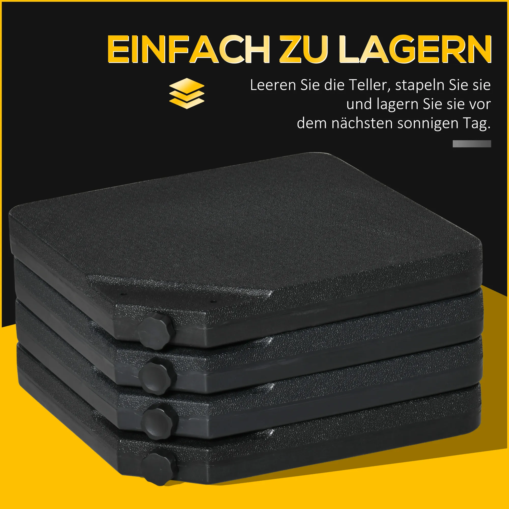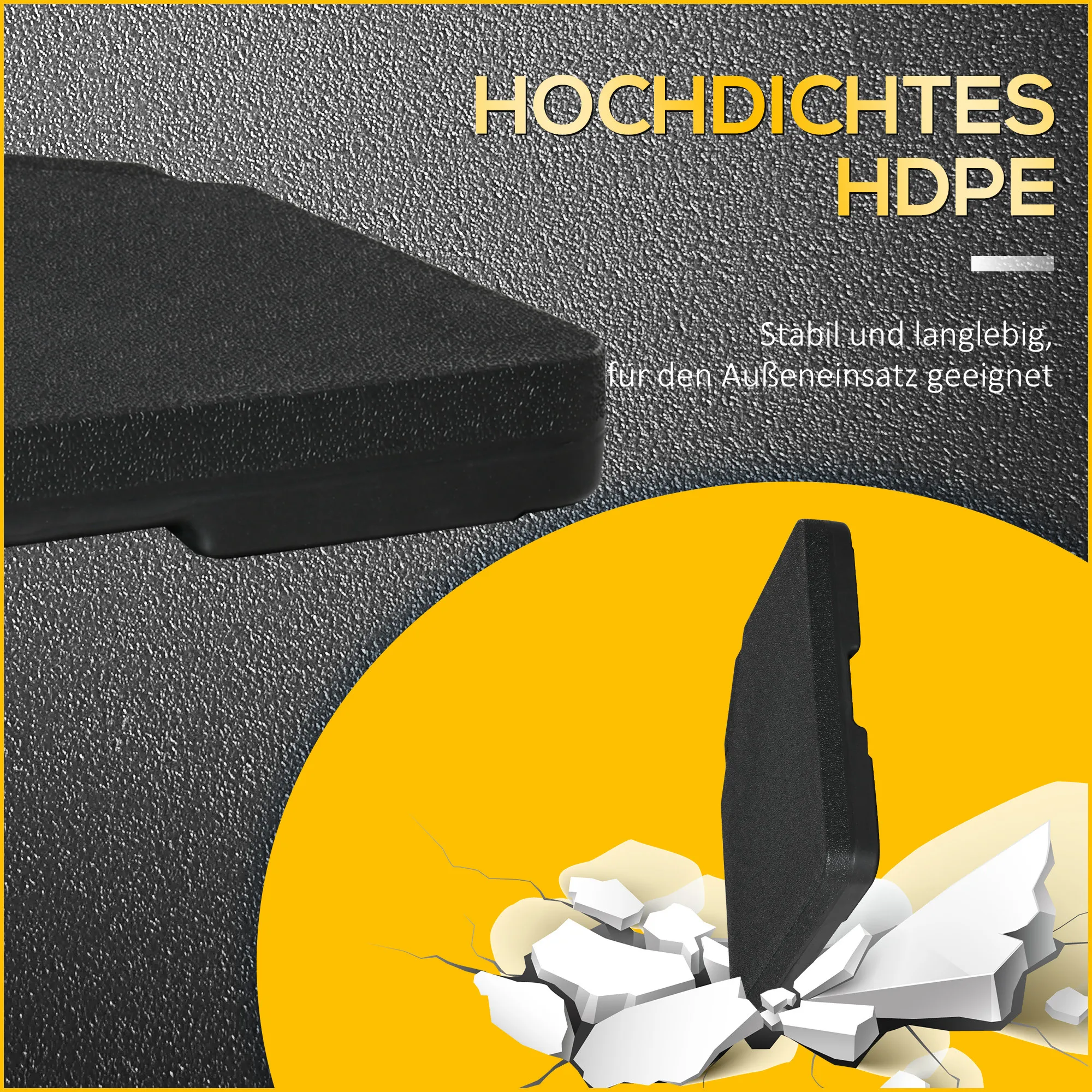 Houd je parasol veilig met de [BRAND NAME] gewichten – ideaal voor cantilever- en bananenparasols. Deze vierdelige parasolstandaard set is gemaakt van duurzaam HDPE-kunststof en kan het hele jaar door gebruikt worden. De platen kunnen snel worden verbonden met haken en gevuld worden met water, zand of een combinatie van beide. De handige vulopening met beschermkap maakt het eenvoudig om de basis te vullen en te legen.