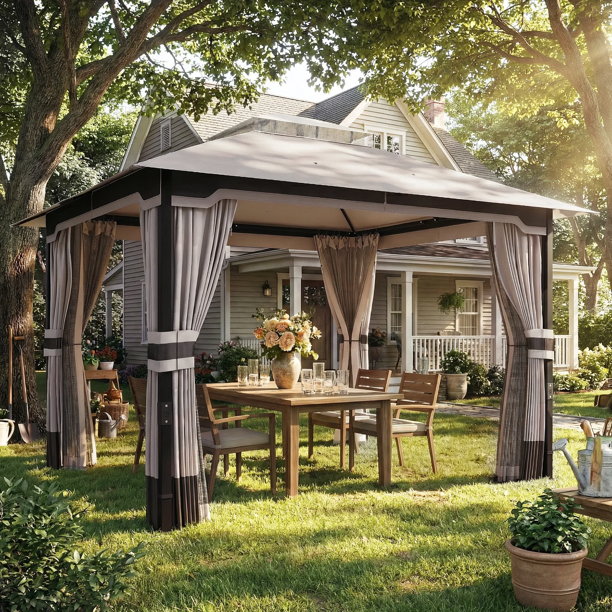 Voeg comfort en charme toe aan je tuin met het [BRAND NAME] tuinpaviljoen. Het tweelaagse dak verbetert de luchtcirculatie, houdt insecten weg en geeft een aantrekkelijke uitstraling aan je buitenruimte. Met de gordijnen en gaas van het paviljoen kun je snel schakelen tussen een open en privé setting. Het poedergecoate frame met verstelbare steunen zorgt voor duurzame stabiliteit, ideaal voor ontspannen bijeenkomsten of rustige avonden buiten.