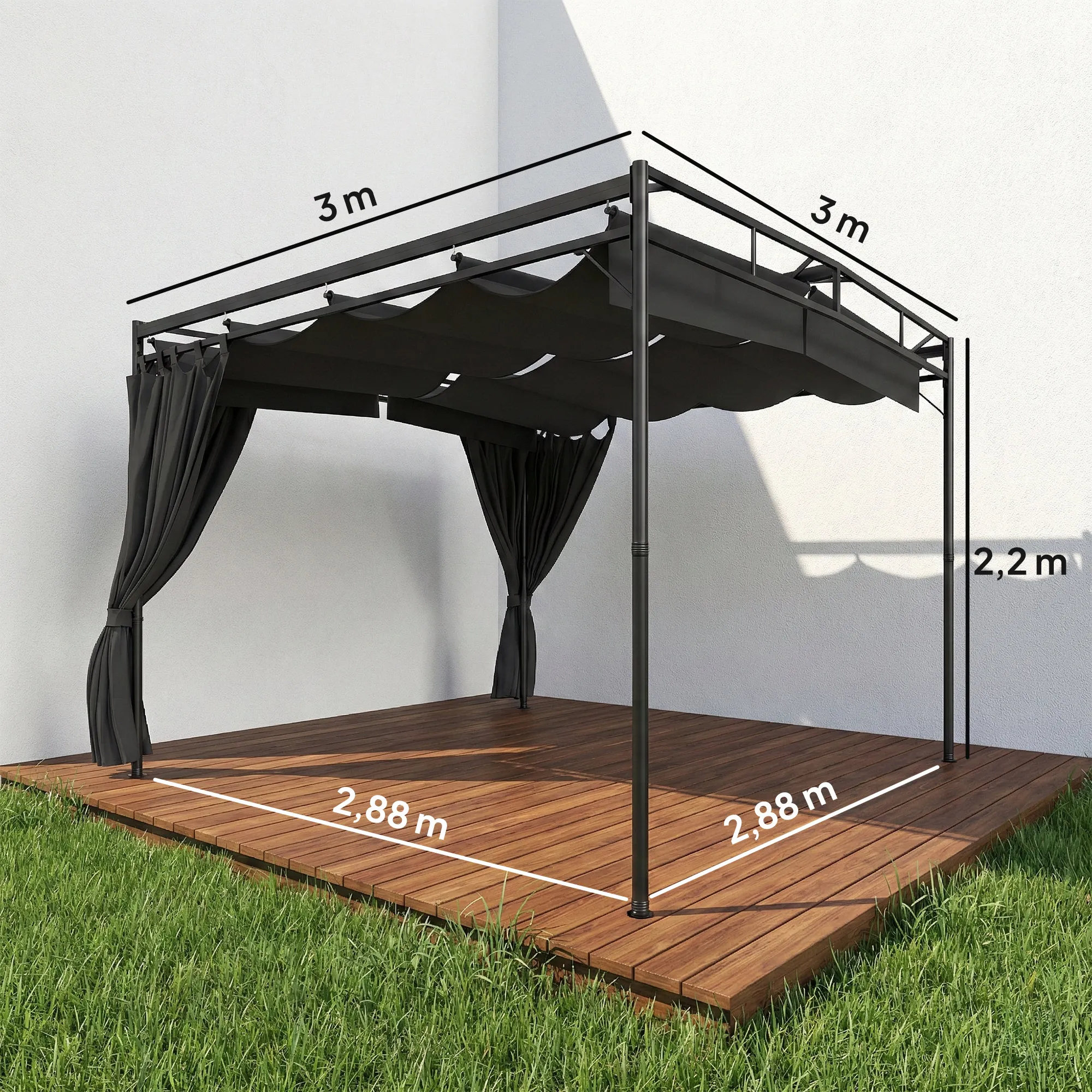 Wil je genieten van je terras zonder nieuwsgierige blikken of onvoorspelbaar weer? De [BRAND NAME] vrijstaande terrasoverkapping met intrekbaar dak biedt de oplossing. Pas het zonnescherm aan voor zon of schaduw en trek de gordijnen dicht voor extra privacy. Het roestbestendige frame zorgt voor stabiliteit en bescherming, zodat je het hele jaar door kunt genieten van een afgelegen oase.