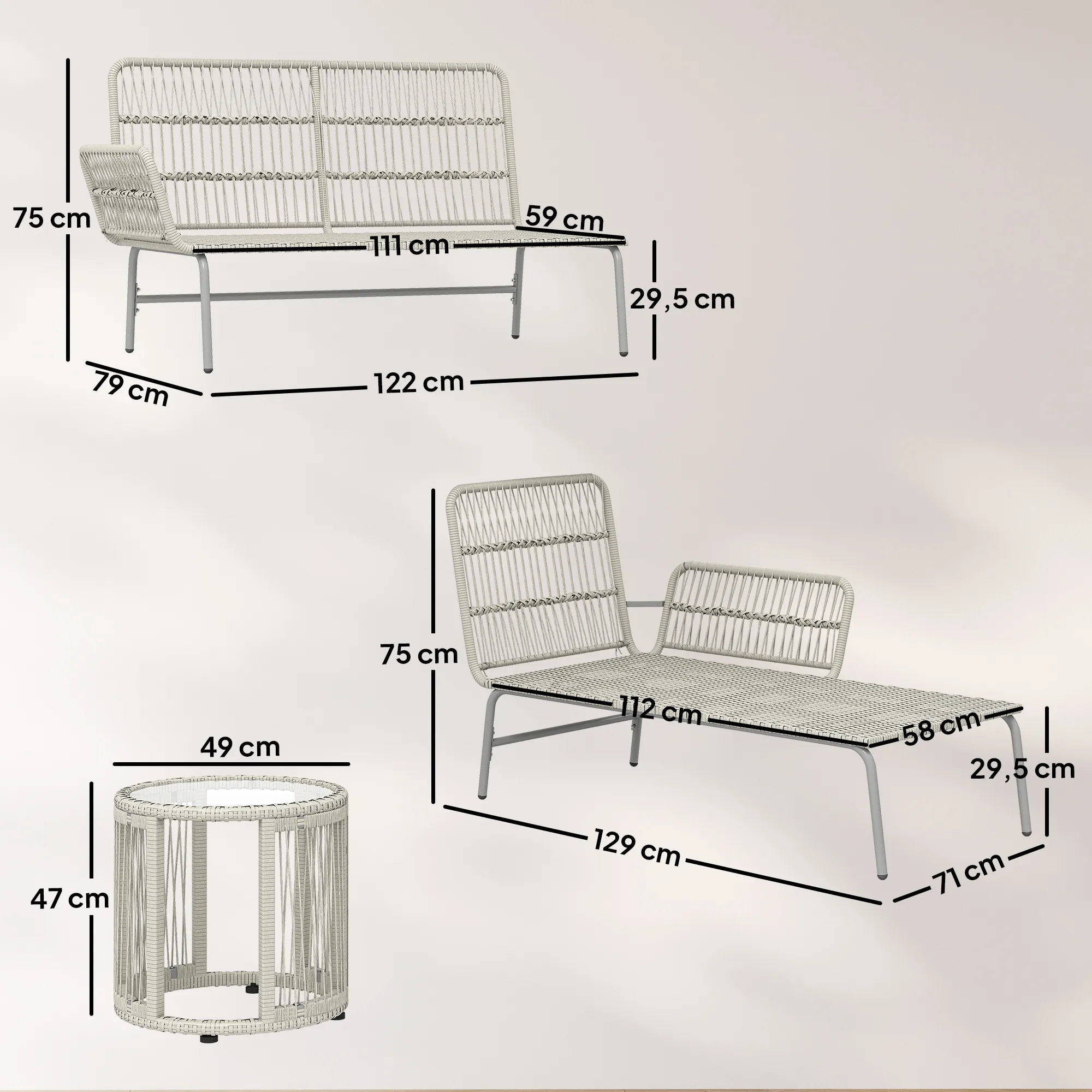 • Materiaal: PE-rattan, metaal, veiligheidsglas, polyester, schuim