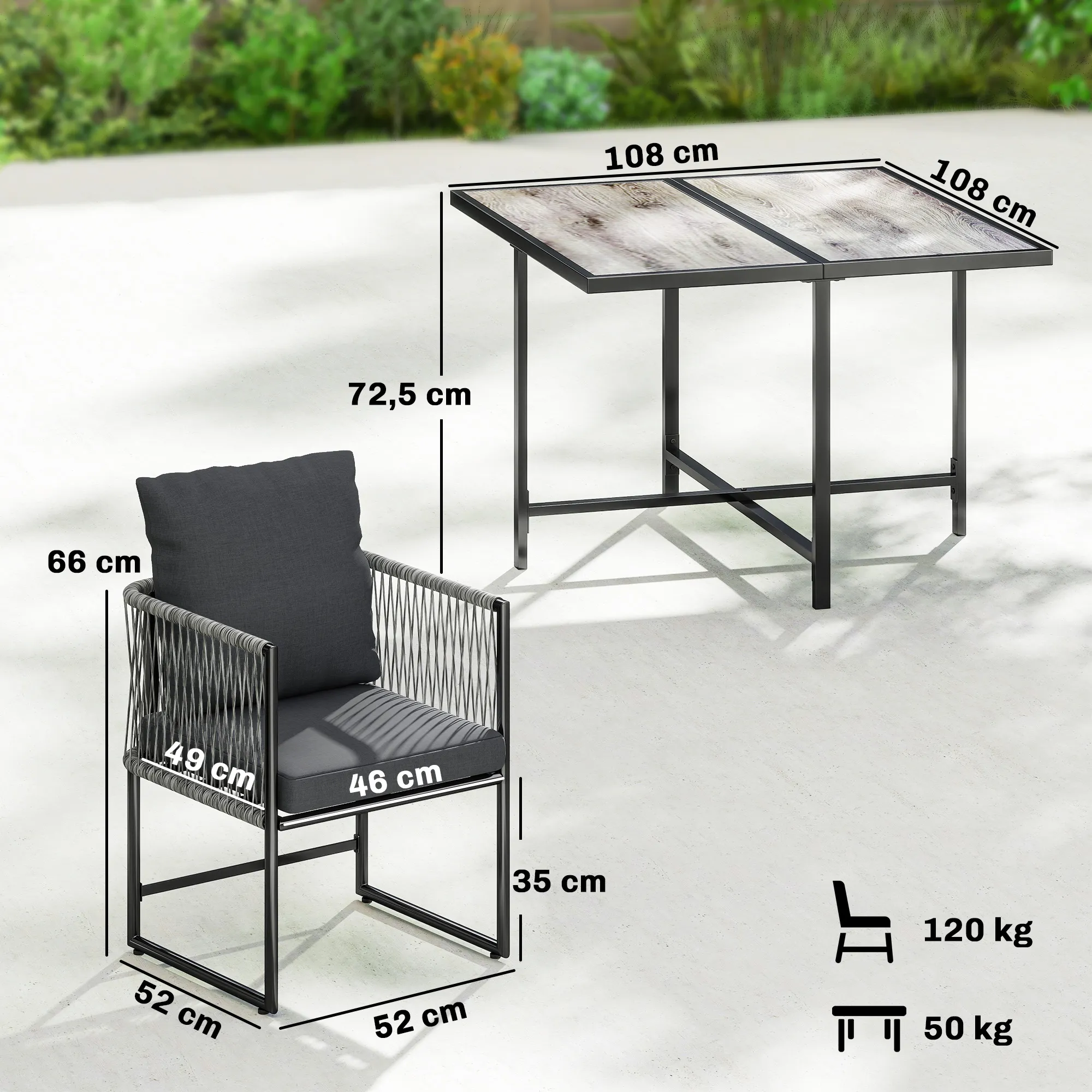 Maak van je balkon een oase van rust met de [BRAND NAME] balkonmeubelset. Deze set biedt de perfecte oplossing voor een chaotisch terras en weersgevoelige meubels. Vier ruimtebesparende stoelen passen moeiteloos onder de tafel, waardoor deze set ideaal is voor compacte ruimtes. Het robuuste DPC-tafelblad in houtlook is kras- en vuurvast, terwijl het stalen frame en UV-bestendige PE-rattan zorgen voor duurzaamheid en weerbestendigheid. Met zachte 8 cm zitkussens en 15 cm rugkussens geniet je van verbeterd zitcomfort, terwijl de verstelbare voeten stabiliteit bieden op oneffen oppervlakken. Het moderne tweekleurige ontwerp in grijs en zwart verhoogt de uitstraling van je buitenruimte, ideaal voor gezellige maaltijden en bijeenkomsten met familie en vrienden.