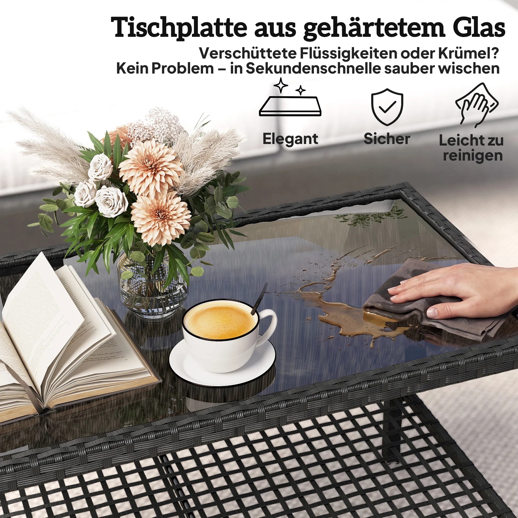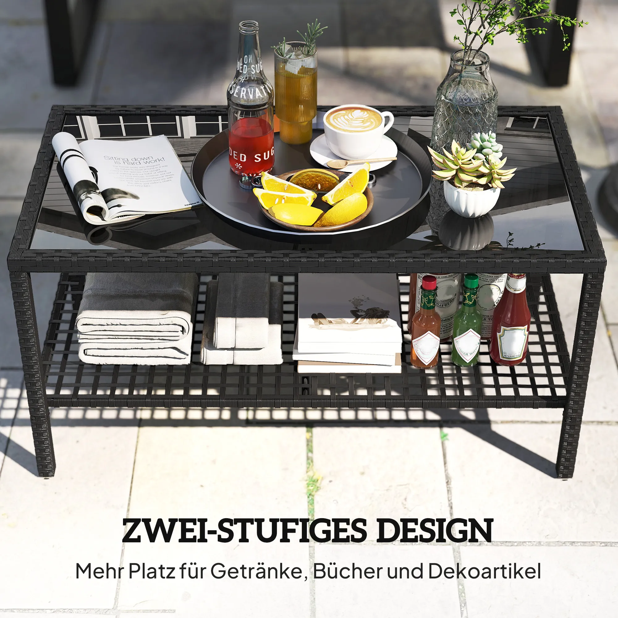 Rieten Salontafel, Tweelaags Buitentafel Met Opbergvak, Gehard Glazen Blad En Stalen Frame, Zwart