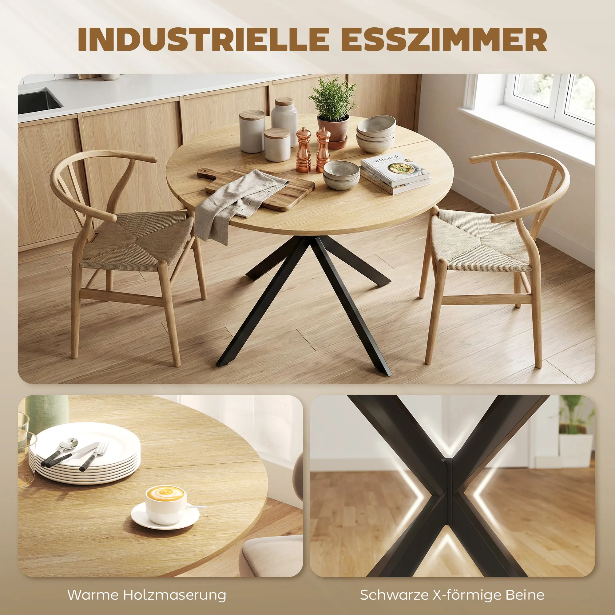 - Industriële charme: rustieke houtlook en zwarte kruispoten