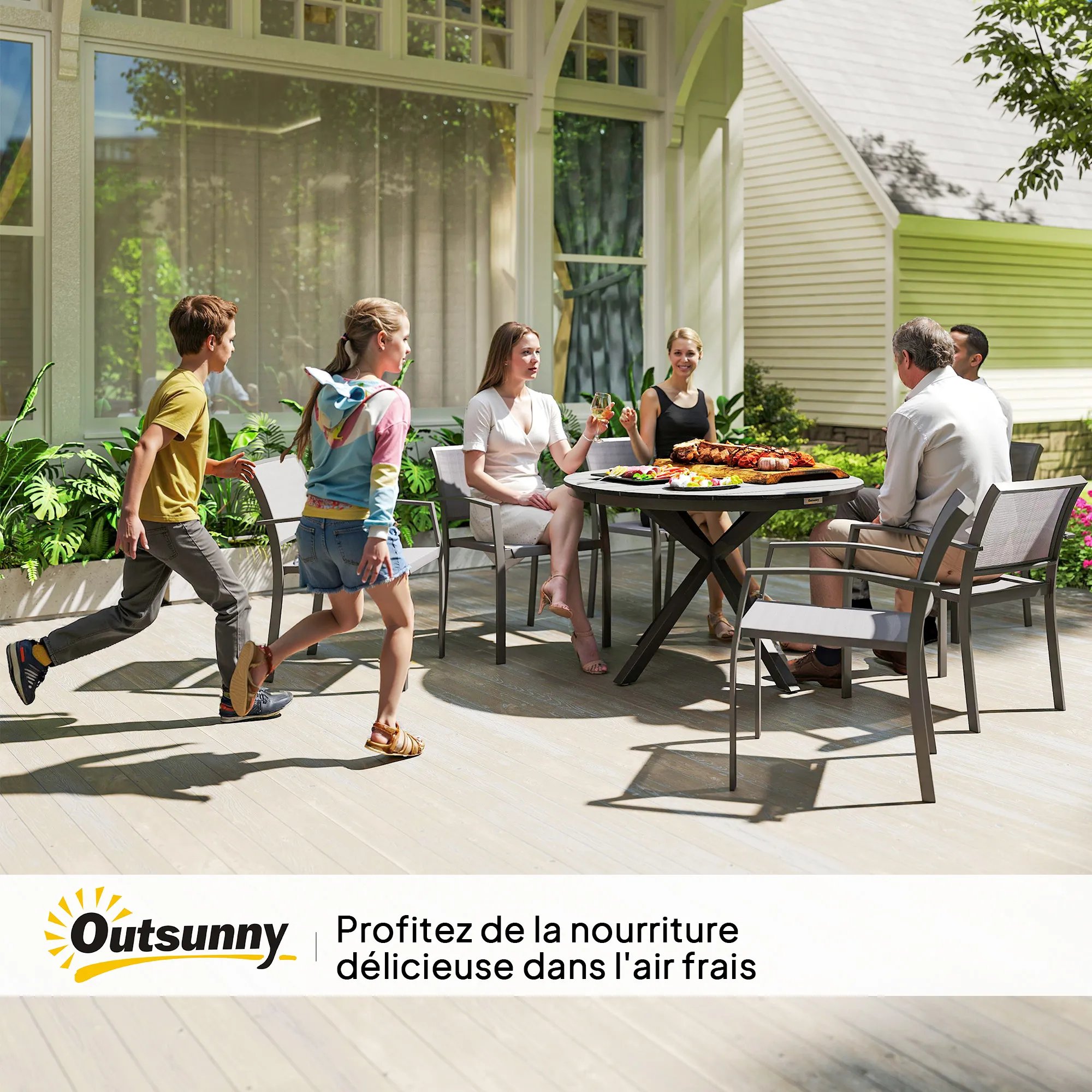 Ontdek de [BRAND NAME] tuineettafel, ideaal voor zes personen. Het stijlvolle ontwerp met lamellen zorgt voor snel drogen, het roestbestendige en lichte aluminium frame is voorzien van verstelbare voetdoppen voor extra stabiliteit. Deze tafel is perfect voor elegante buitenmaaltijden waar functionaliteit en modern design samenkomen. Geniet in stijl van het buitenleven!